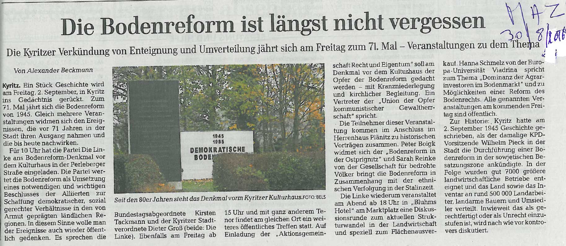 sie sagten, und sagen es noch heute, es sei geschen, um den Armen das Land der Reichen zu geben und den Flüchtlingen des Ostens, die sie Umsiedler nennen mussten, etwas abzugeben. Um sich wenig später in der LPG des Staates das enteignete Land wieder zu holen. Wie nach 1989 der Westen sich das Land nahm, um sich selbst über die Treuhand zu bereichern. Alles Land ist in beispieloser Umschichtung heute in den Händenen der ehemaligen LPG Funktionäre oder westlicher Grossbetriebe der Industrien.