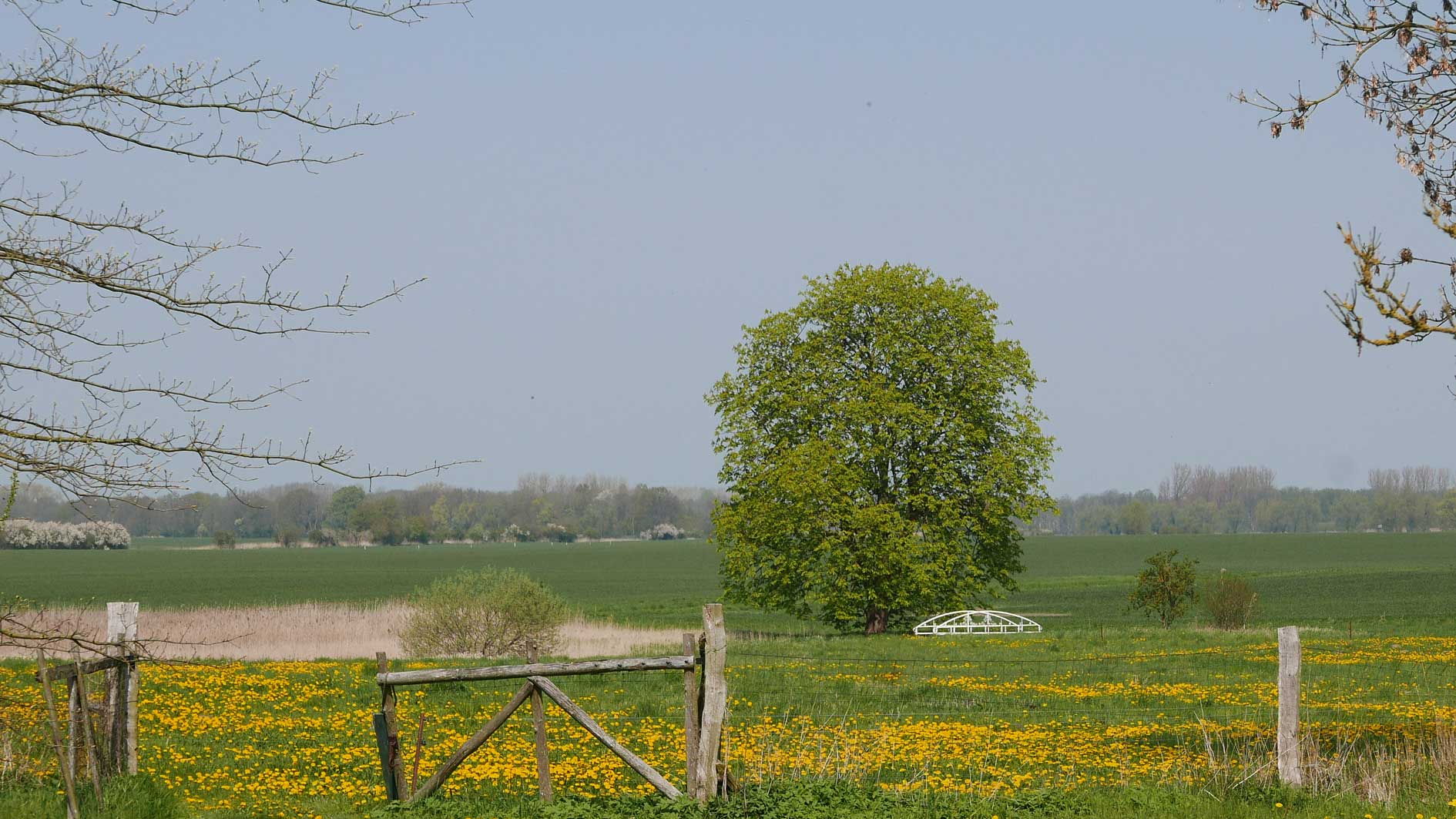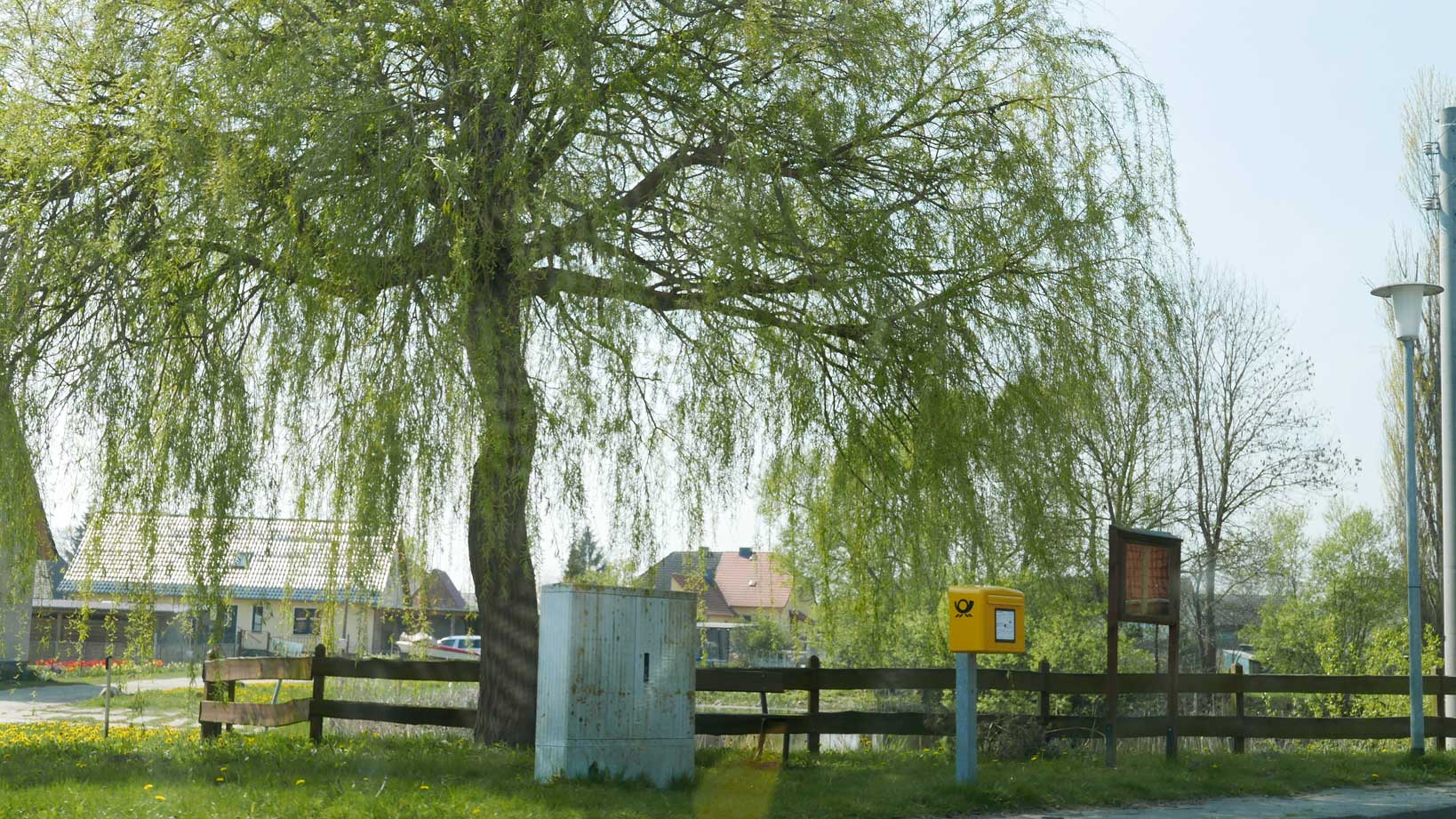vorbeifahrnd die Begrüssung am Teich mit freundlich gereinigtem Weiss im Bild und eliminierter Bank