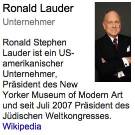 R.Lauder ist der Hauptbetreiber der "Restitution"s"Griffe in die deutschen und österreichischen Museen und Gesetze ehemals durch jüdischen Hände gegangener Kunstwerke Europas in die USA zu transferieren . Er selbst besitzt ein oder das grösste Museum dieser Werke in in NY.