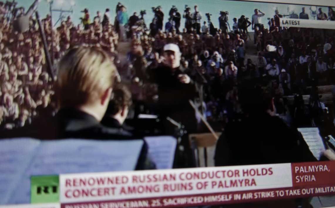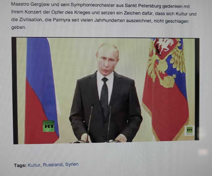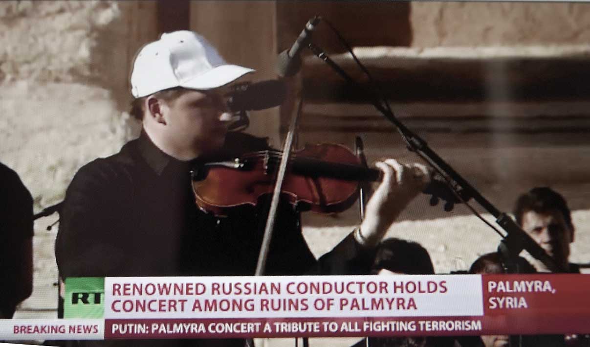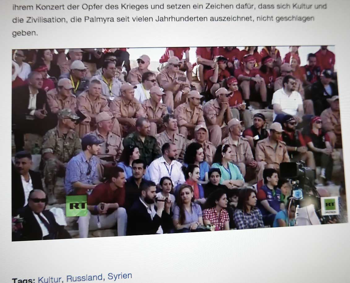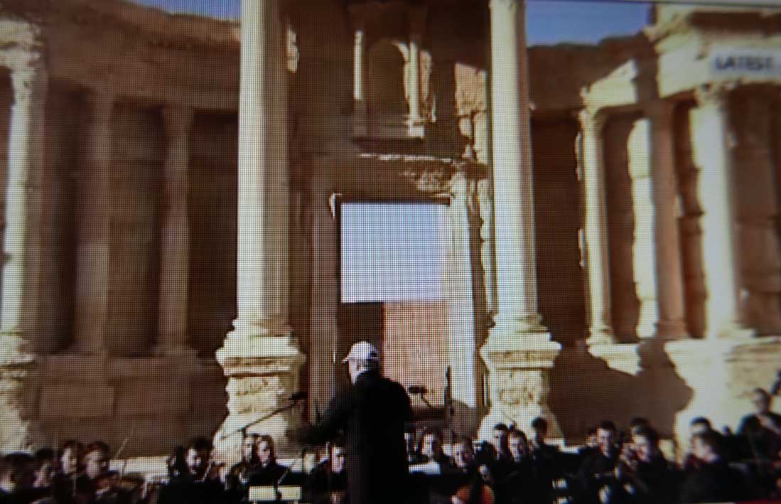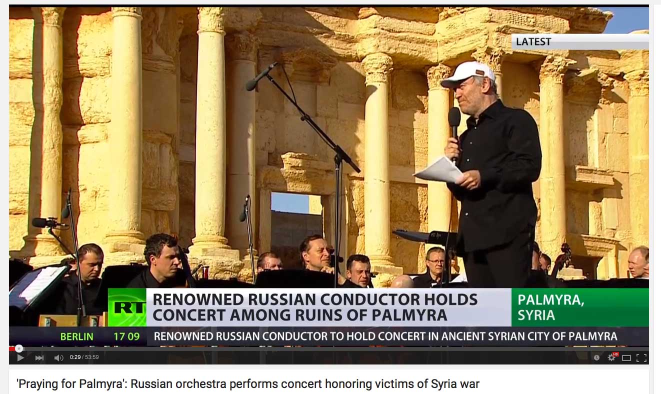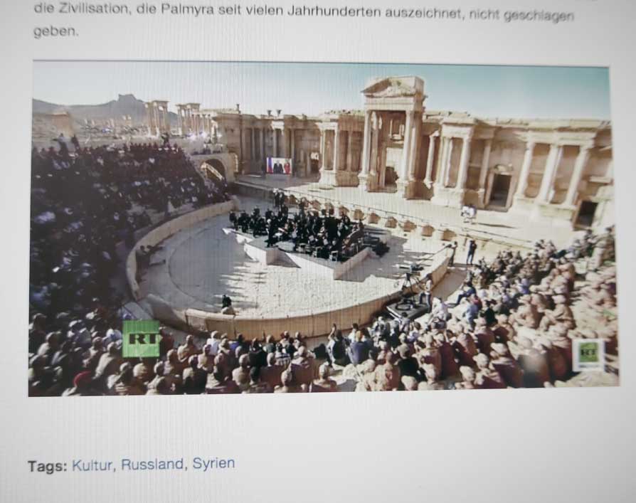 Nach dem Aufschrei in allen Medien des letzten Jahres über die Zerstörung der alten Kulturen, unserer Geschichte im nahen Osten durch die IS und nach der Frage, warum nicht ein Flugzeug dort eingriff als noch die Amerikaner und ihre Verbündeten die Lufthoheit hatten und nach der Befreiung wenigsten von Palmyra nach den Bildern von den Hinrichtungen auf der Bühne im antiken Theater dort nun dort Bach von einem der gössten Solisten mit einem Konzert eines der Grossen der Dirigenten von heute keine Nachricht in allen Quellen, die damals aufschrien. Nicht einen Ankündigung, keine Übertragung, nicht einmal eine Erwähnung danach, als das Unglaubliche stattfand.