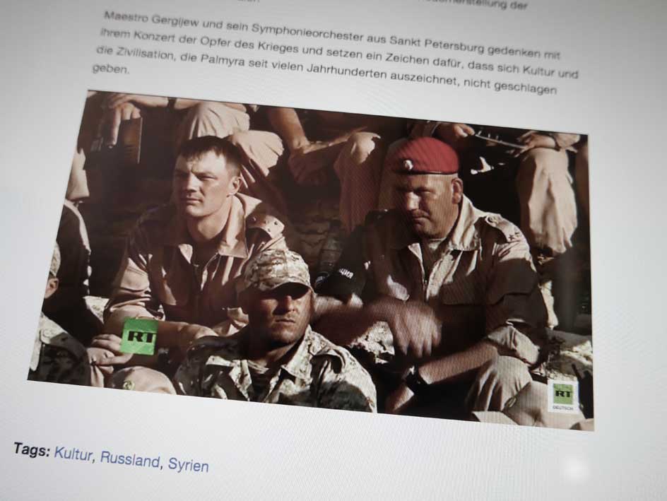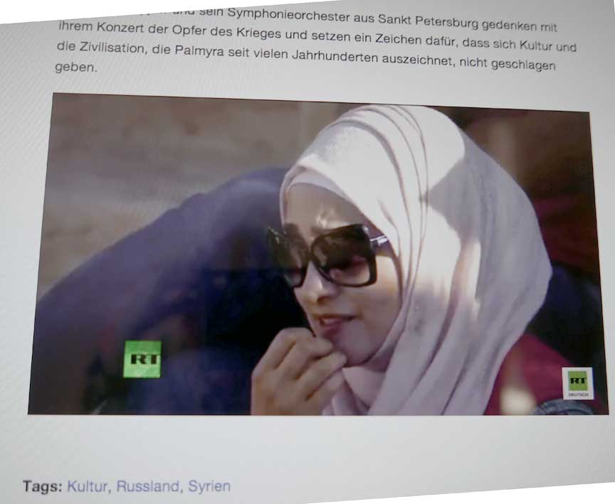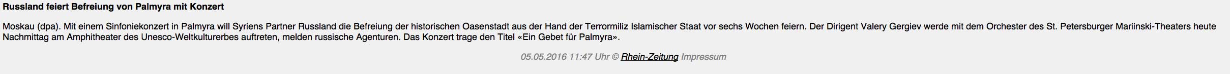 eben in dem lokalen Sender NDR hier, der Morgennachrichten,von einem Sommer-Konzert der Welt in Greifswald, dann auch - vom Zynismus in Palmyra wo gleich nebenan gebombt wird dies. Ein Konzert dagegen...