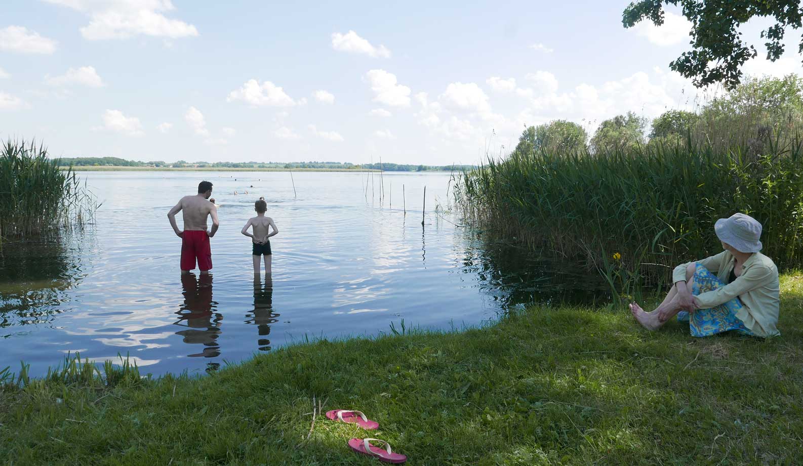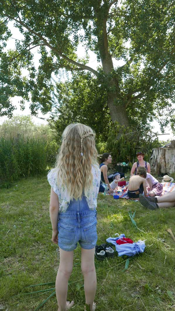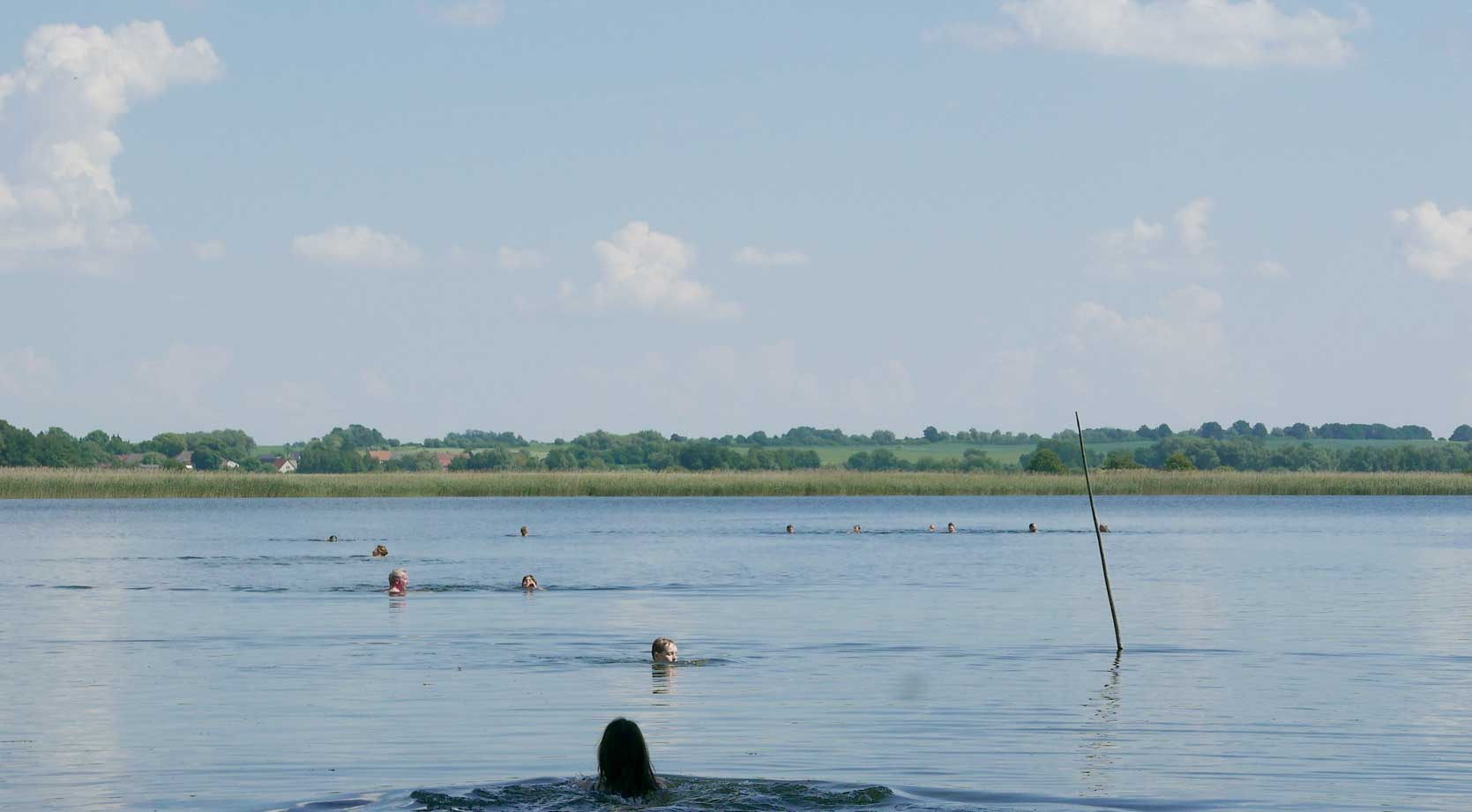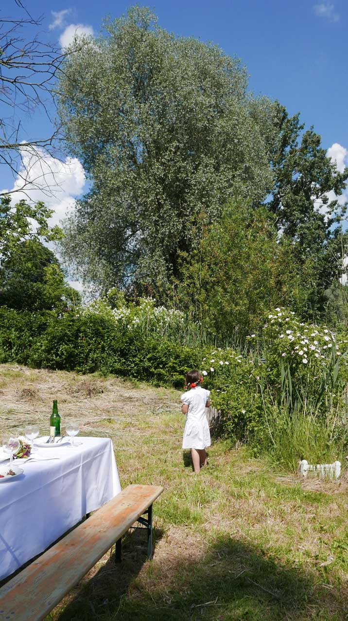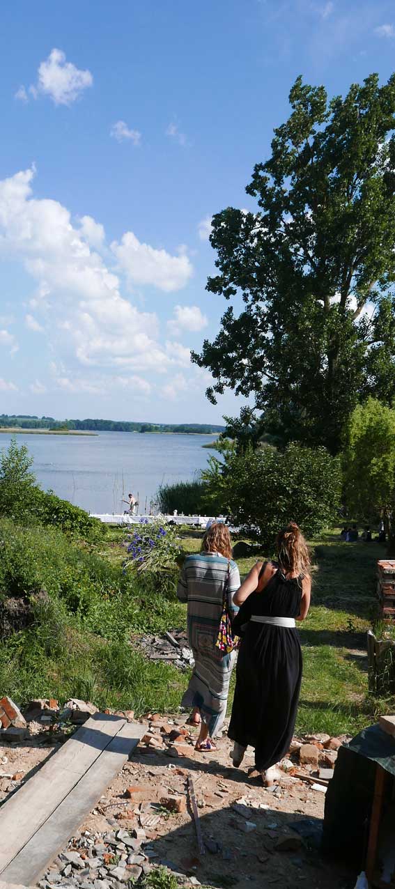 in N. das Baden an der Trebel, das Ufer nun in Gefahr. Neben 42 Meter Beton plus Stahl Ufer und Fusballfeld-grosser Wendeschleife für LKWs. Im Herbst alles Schilf weg und Sonnenblumen: "Entkrautung", dass es besser fliesst.