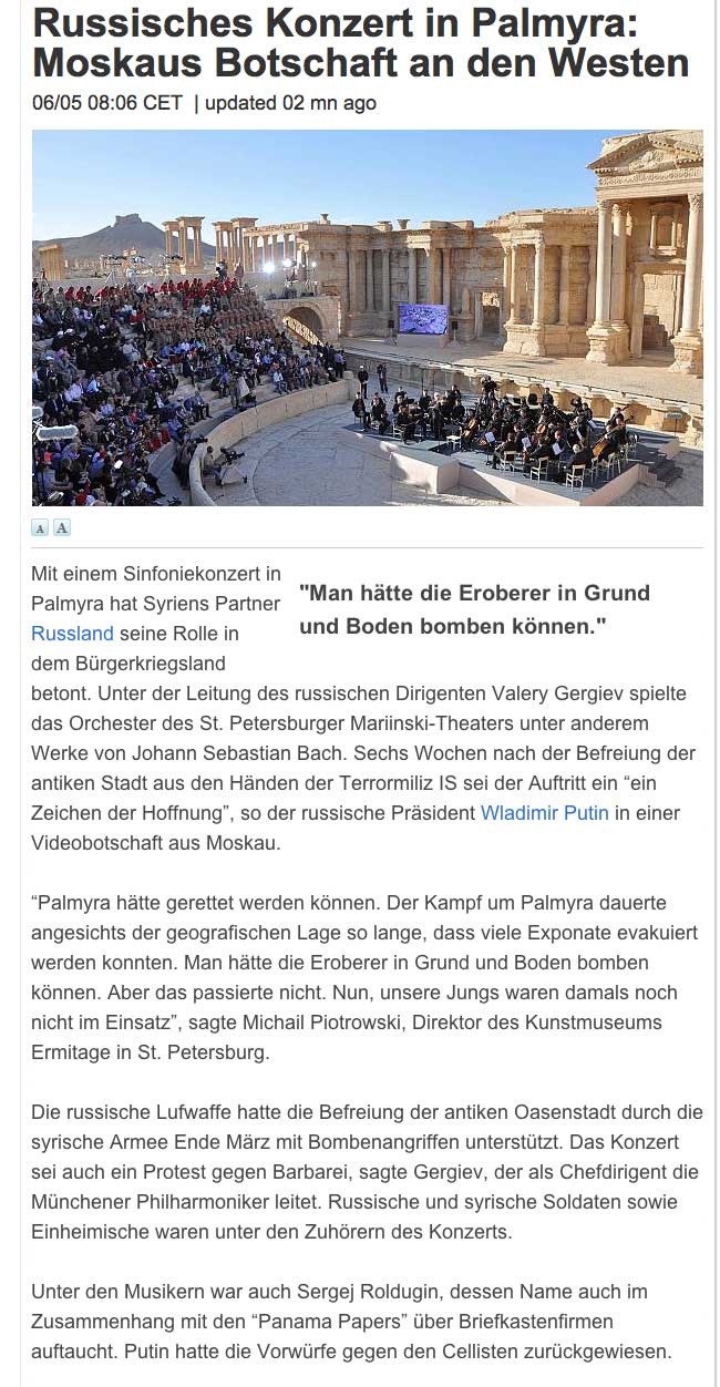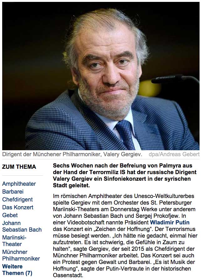 Den Anfang der Programms macht J.S. Bach sagt V. Gergiev und am Ende Prokovjew mit einer Hommage an Mozart und Haydn. Selten waren sie so nötig und fruchtbar als Antwort auf soviel von Vernichtung und Bösem kontaminierten Steinen.Von Todes Angst und Blut getränkter Natur beantwortet mit anderem Raum unserer Möglichkeiten.