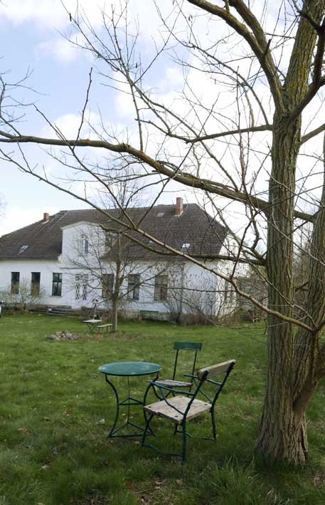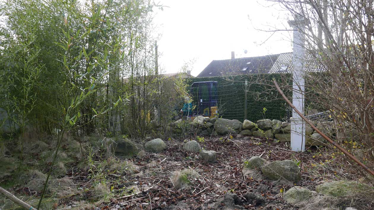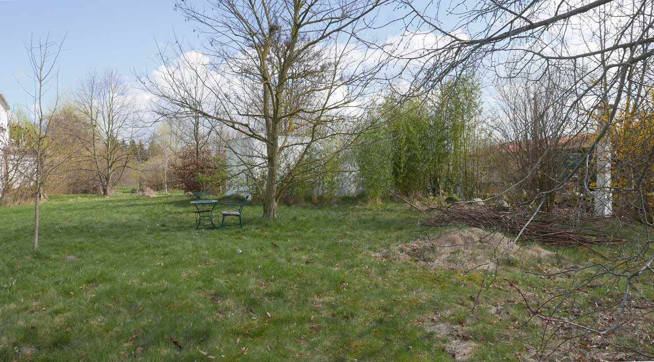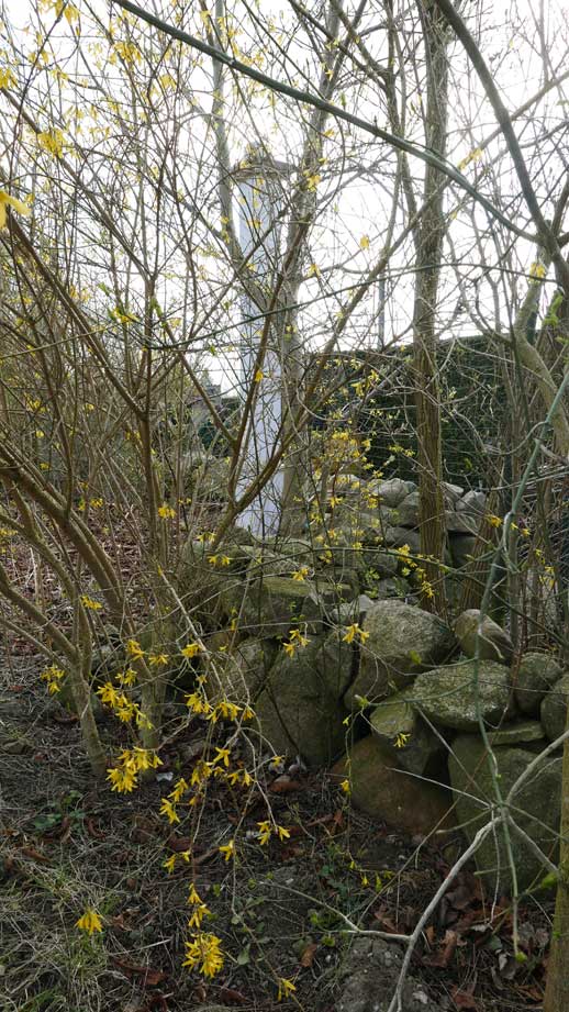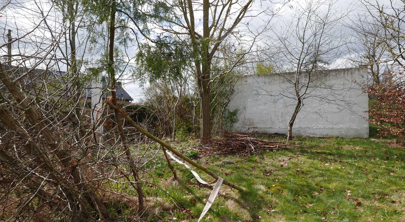 dort rechts der Steine verlief der alte Weg aufs Feld, links die Stellmacherei und Garagen bis hinauf zum Kuhstall, dem ehemaligen.