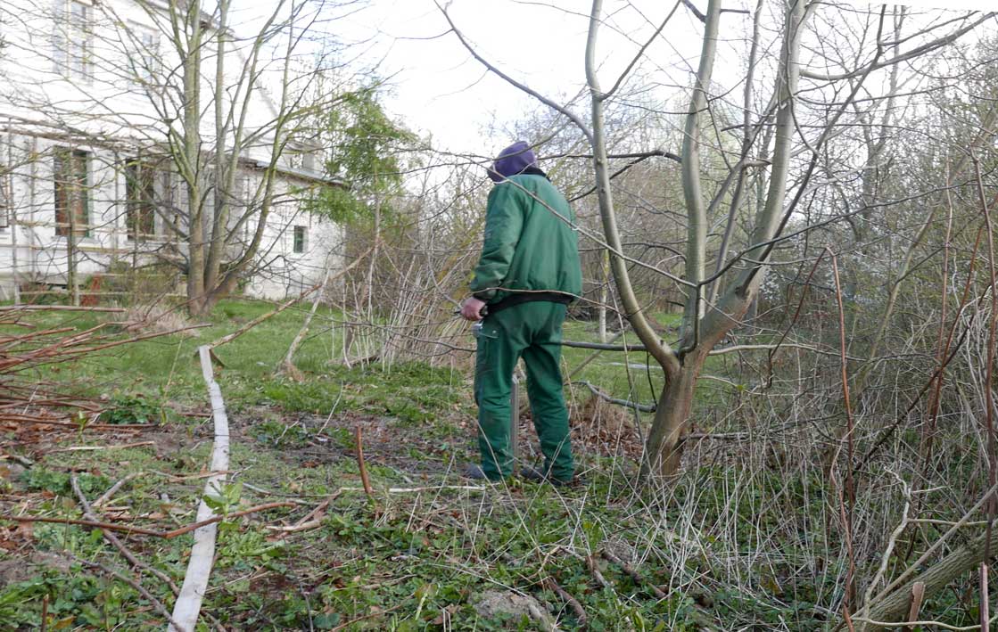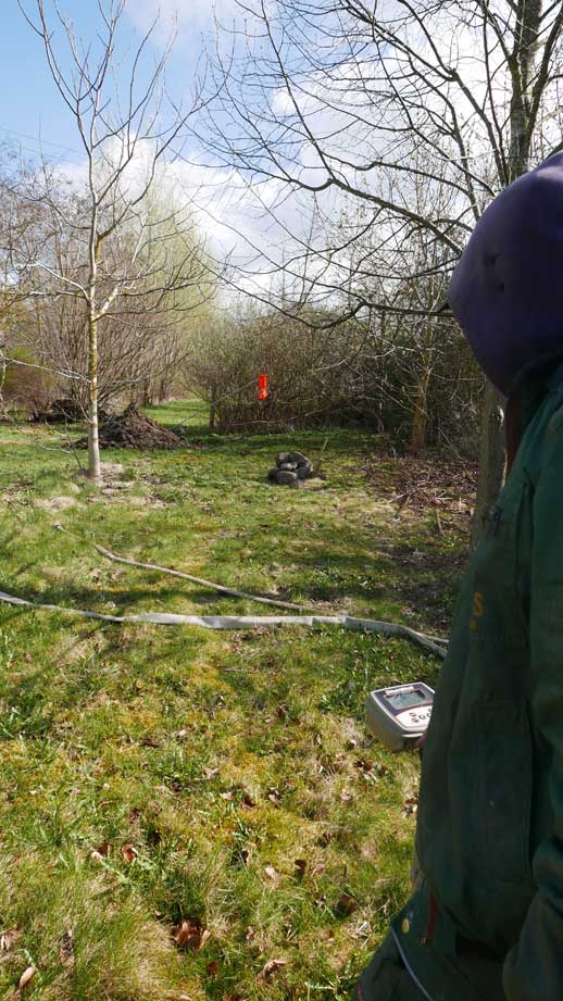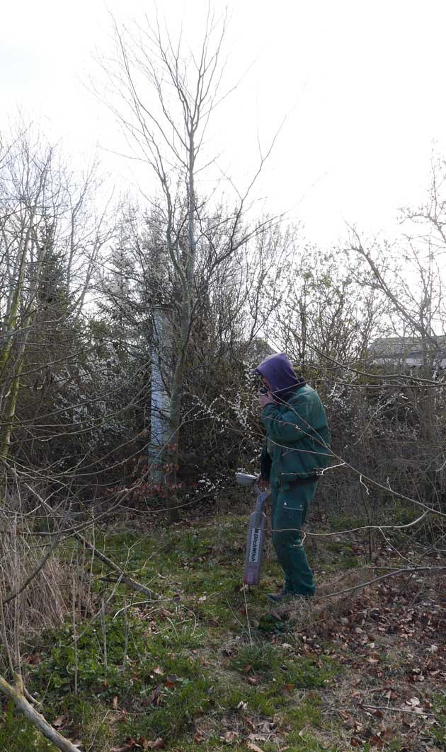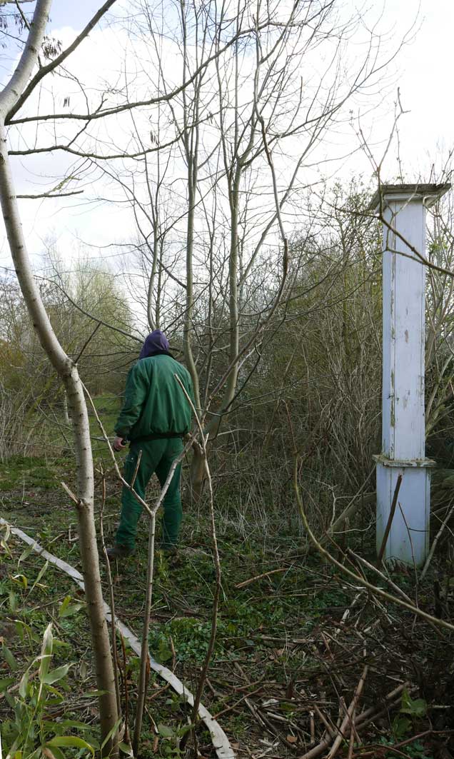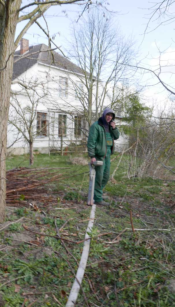 hier wo die im Krieg stillgelegten Motorräder und besonderen Autos des Vaters standen und wo die Inga noch am Tag vor dem 1. Mai vor den Gewehren der Militärpolizei stand als sie die weisse Fahne aus dem Haus hängte, der vielen Flüchtlinge, nun die Sonden geführt für das Wasser hin und her.