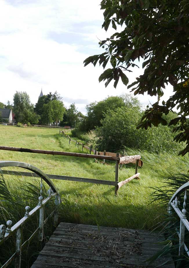 die Brücke führt ins Dorf am Zaun entlang nun und nachhaus