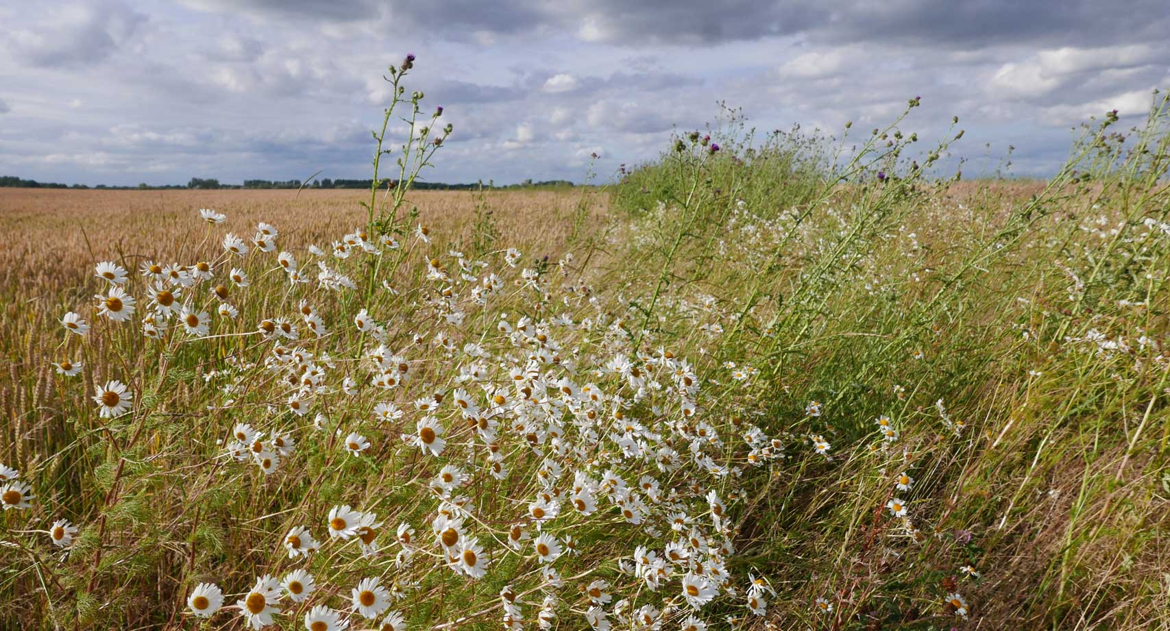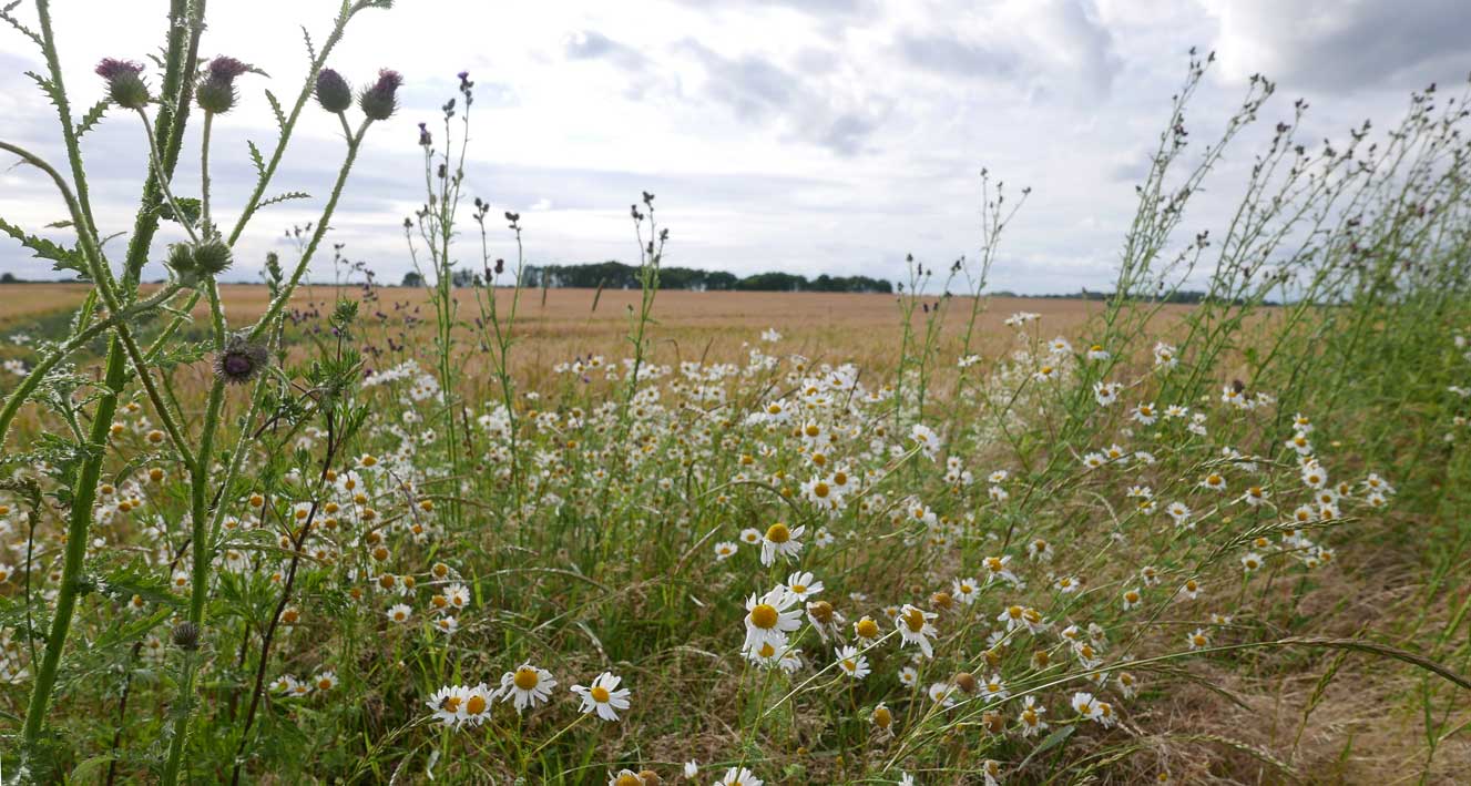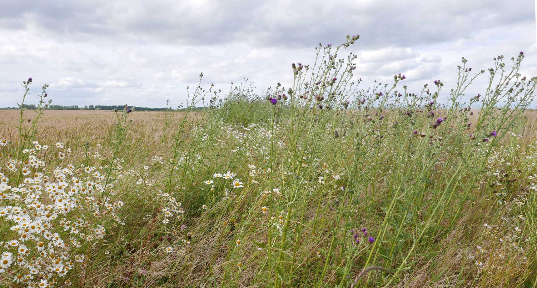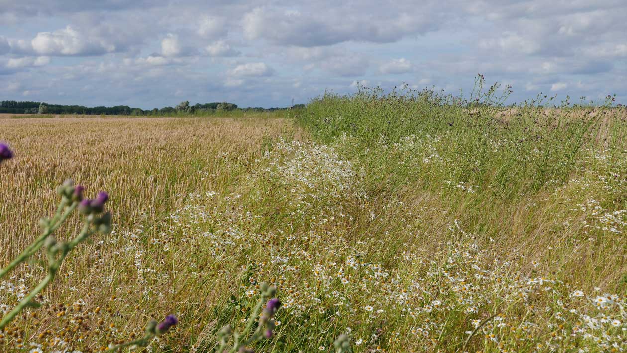 Der Weizen ist von disen Randflächen weit hinein geschädigt, aber steht.