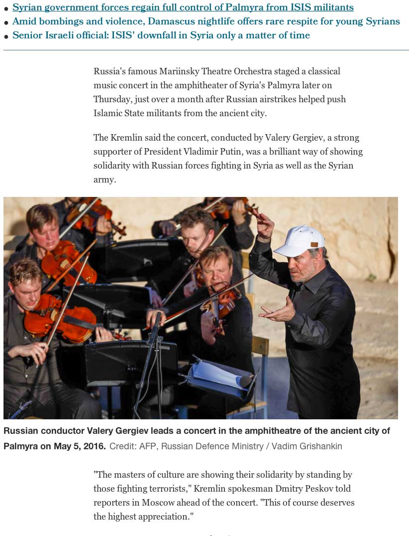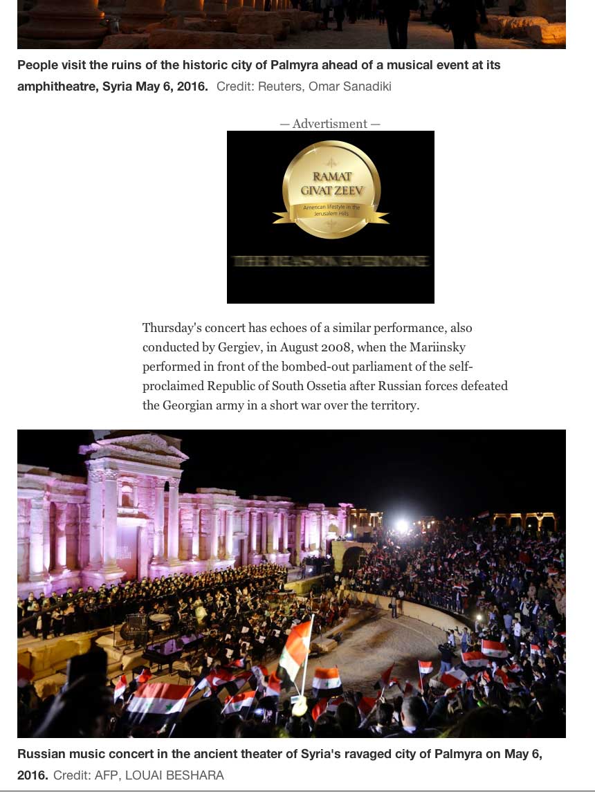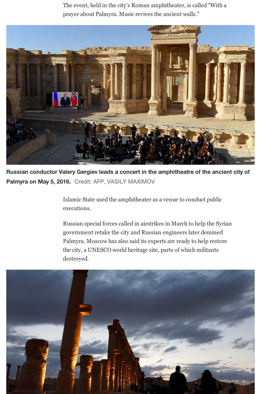 Das Konzert der Russen in Palmyra, dem befreiten, in 4 Versionen berichtet.