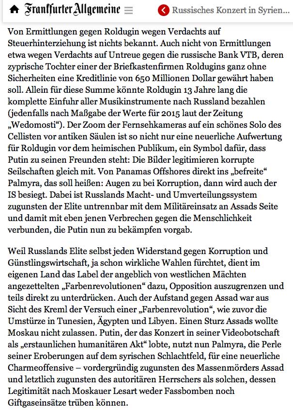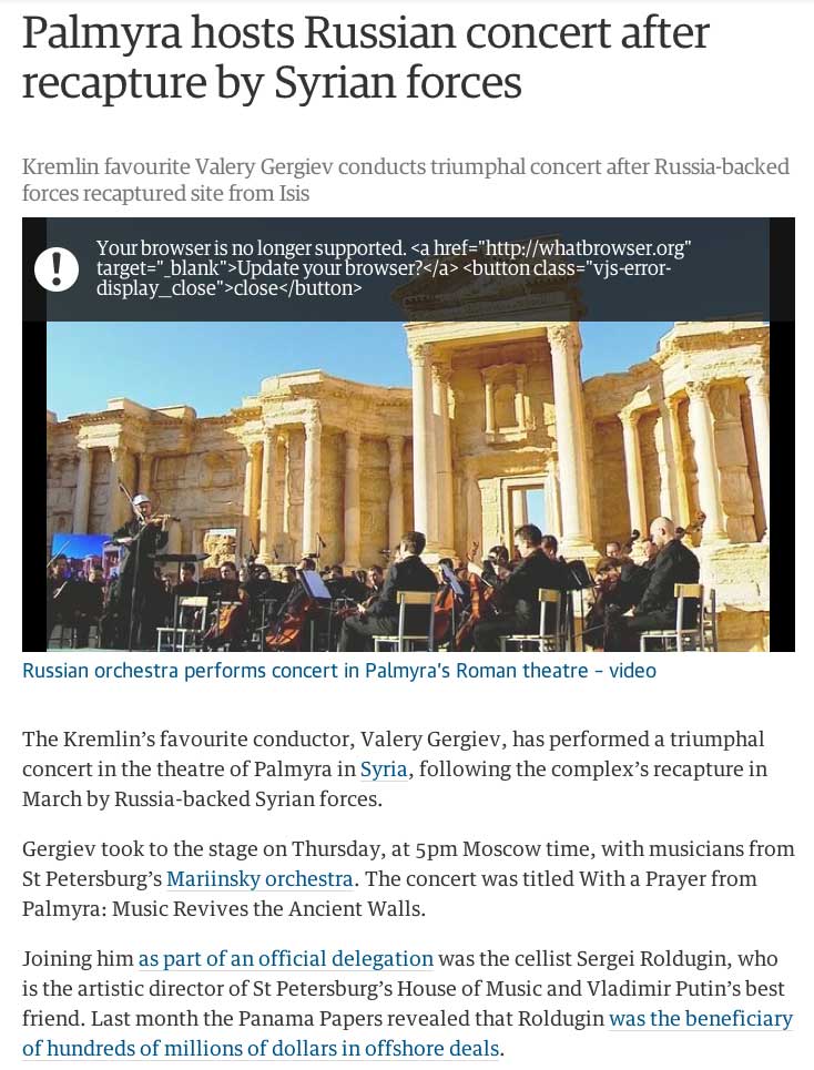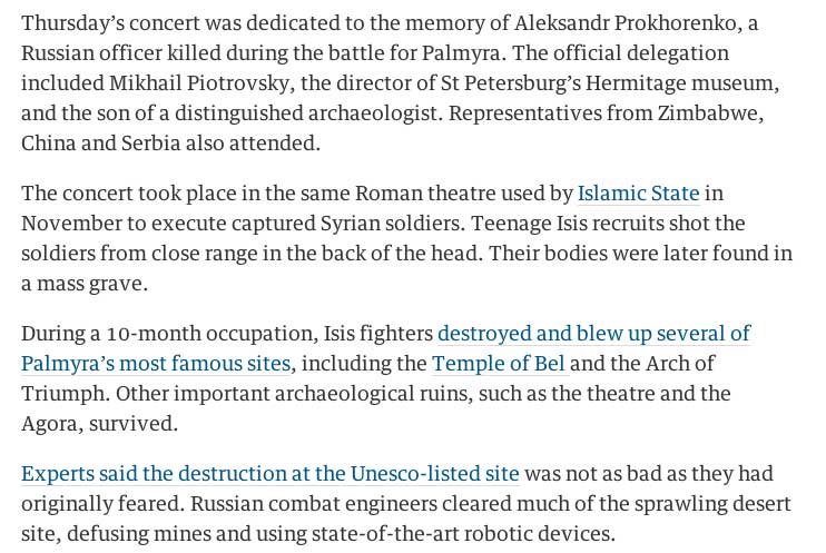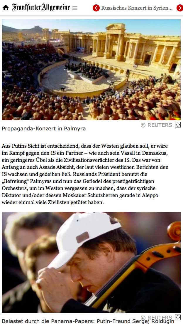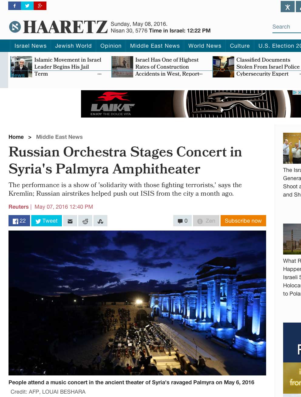 Das Konzert der Russen in Palmyra, dem befreiten, in 4 Versionen berichtet.