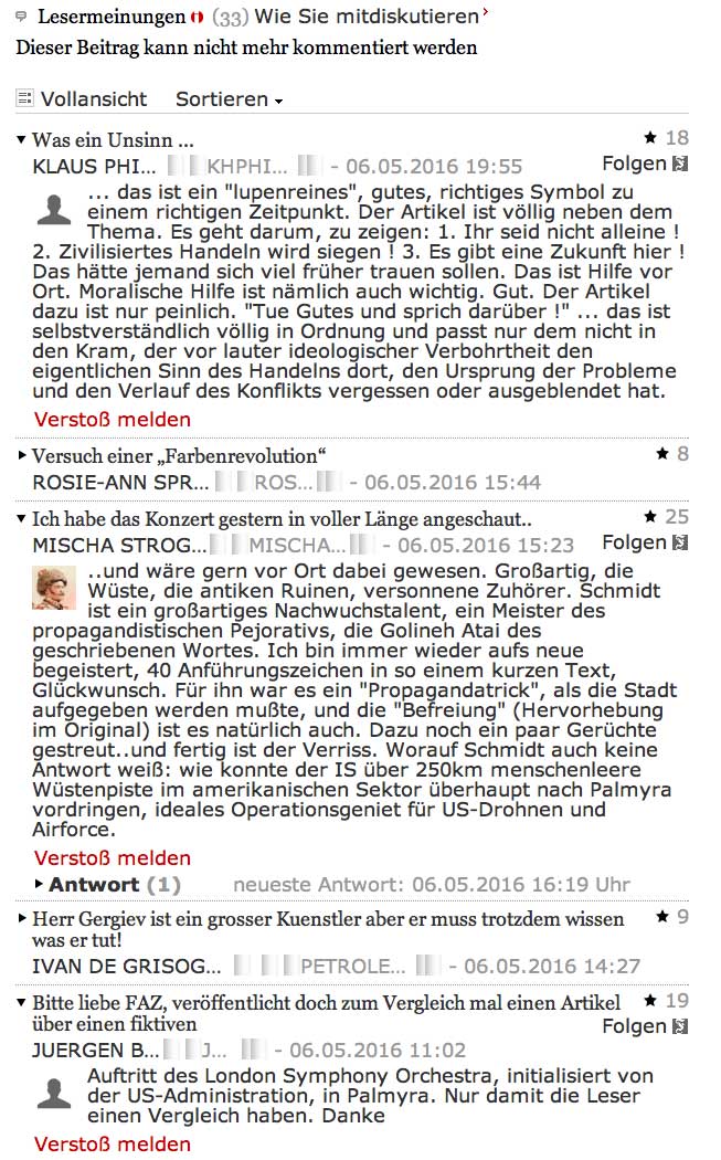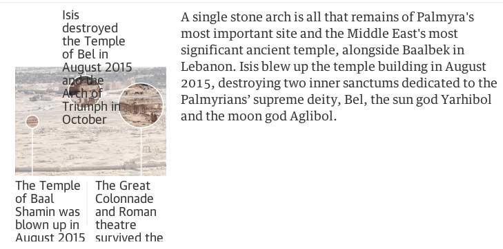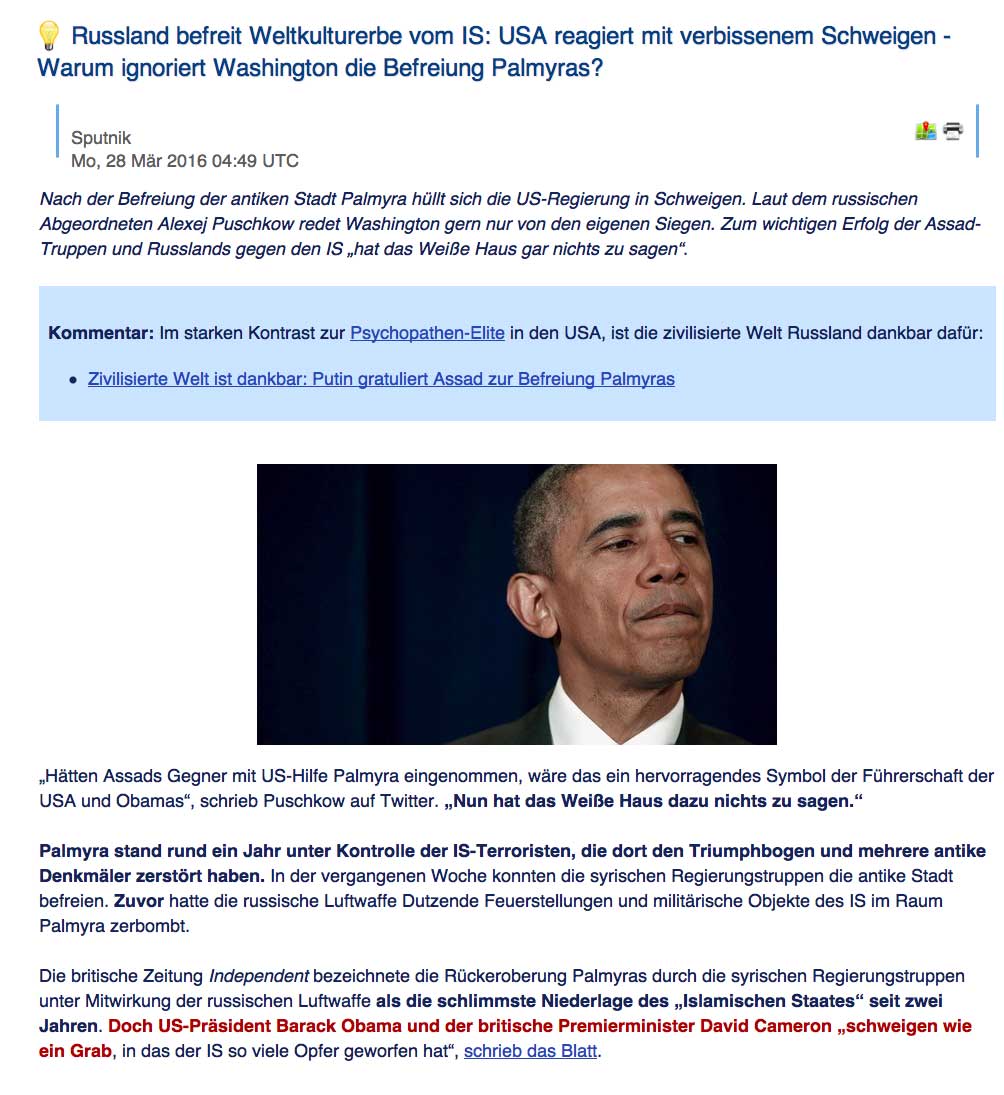 Aus Israel nach 3 Tagen auch ein redlicher Bericht aus Palmyra. Der nach wenigen Minuten wieder verschwand. Vielleicht, weil er der Zensur nicht passte. Aber die Readaktion immerhin wiederstand wohl einer empfohlen Kommentierung(s.o. in dt. Version). So macht man das dann, wenn man frei ist und gut.