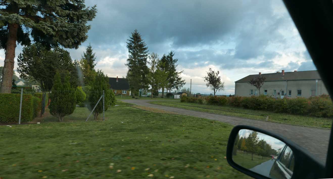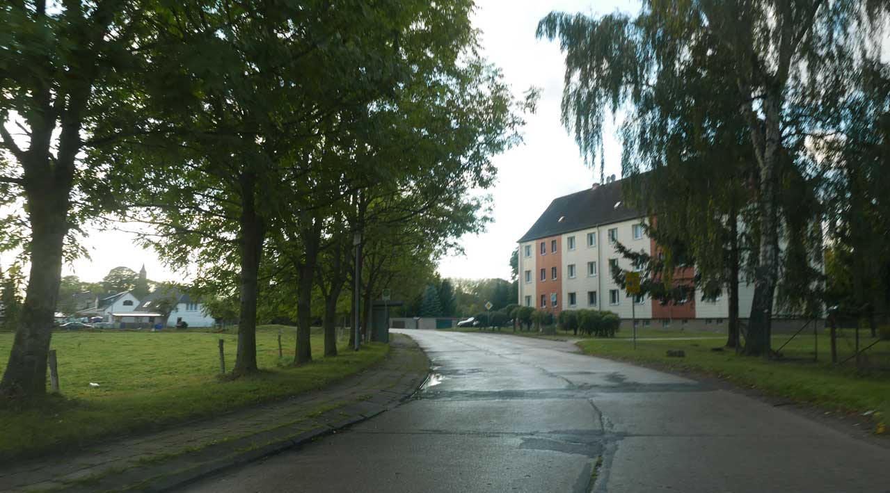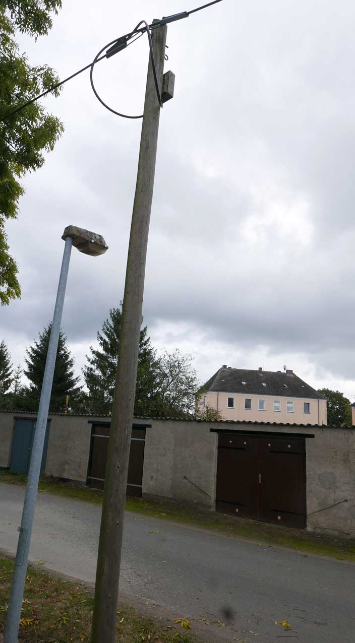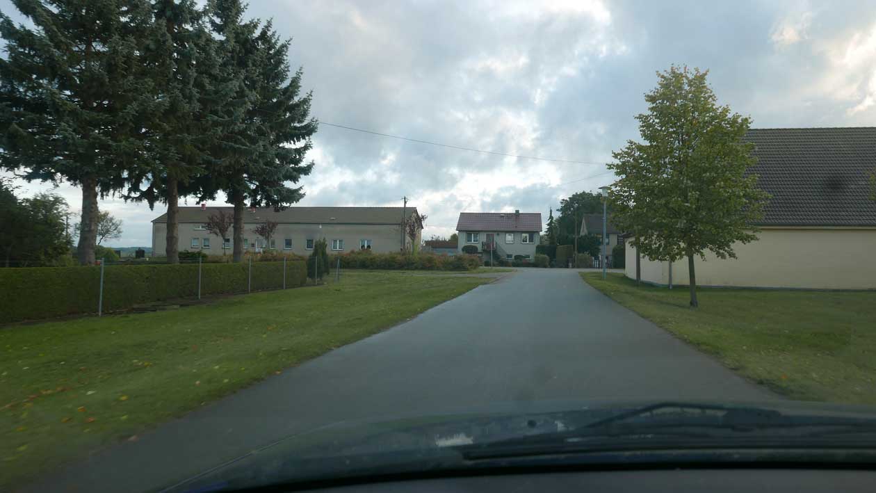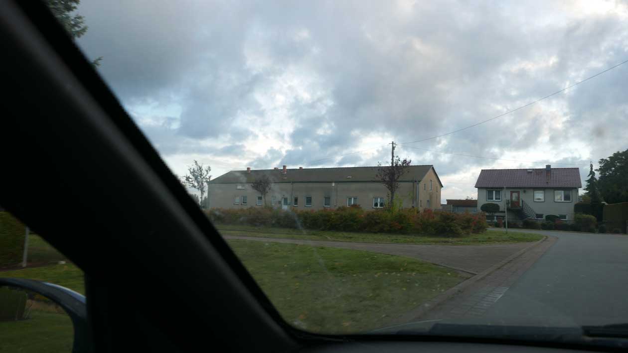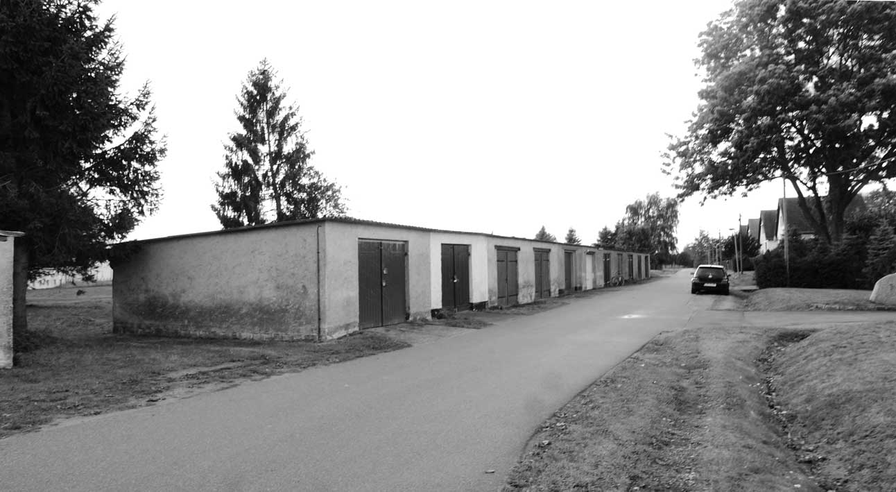 in den Park der ehemaligen Anlagen, links noch die Klein-Gärten des Dorfes nun, rechts die neuen Häuser heute mit ihren Gärten auch. Aber dazwischen hier wo das erste Gemeinschaftshaus der entsehenden LPG entstand wurde alles einer seltsamen Leere geopfert. Garagen und darum das graue Nichts. Wo doch Leben ist - und sei es aus den Garagen selbst.
