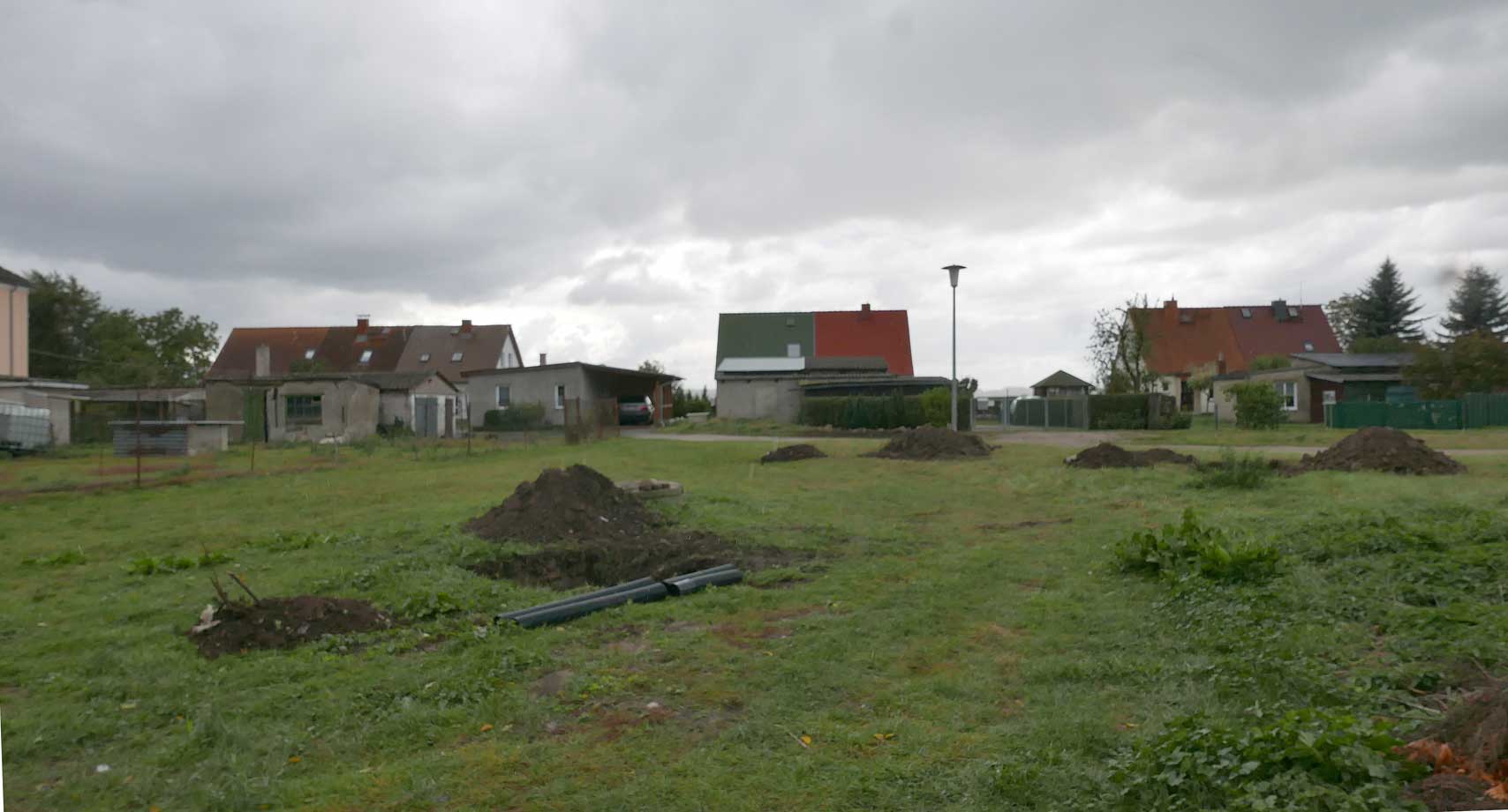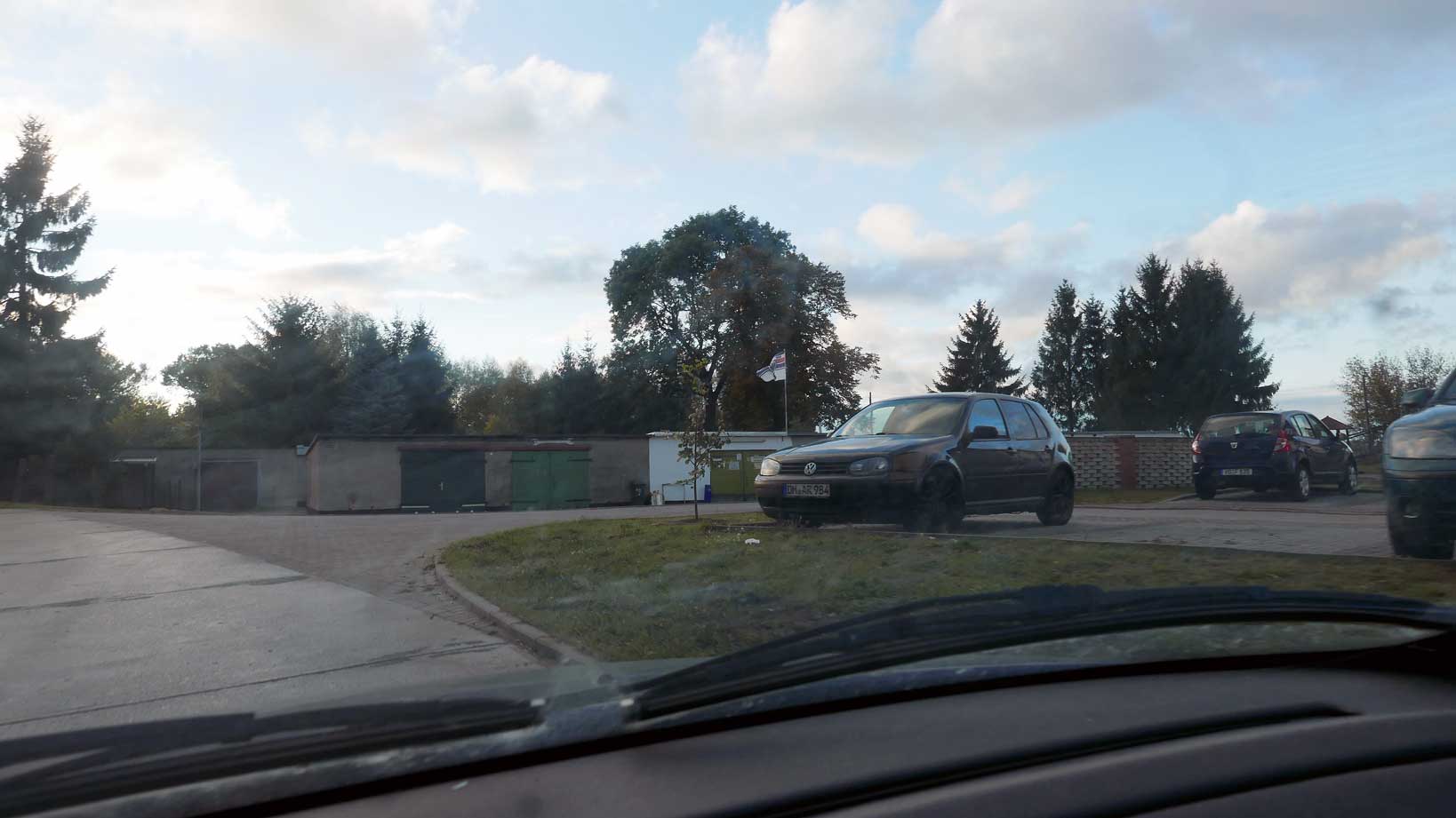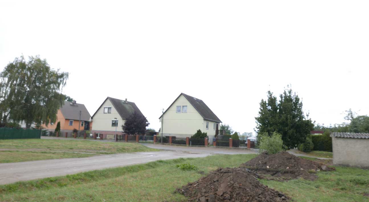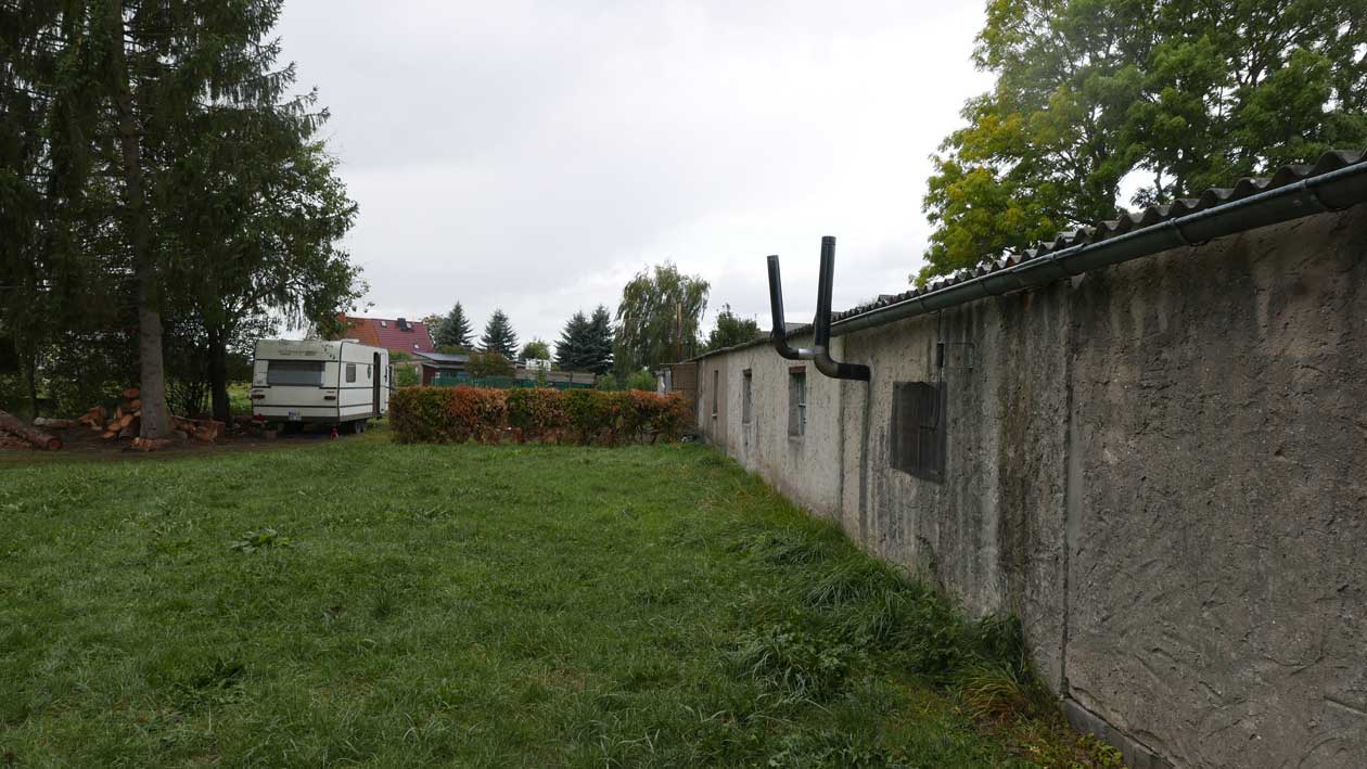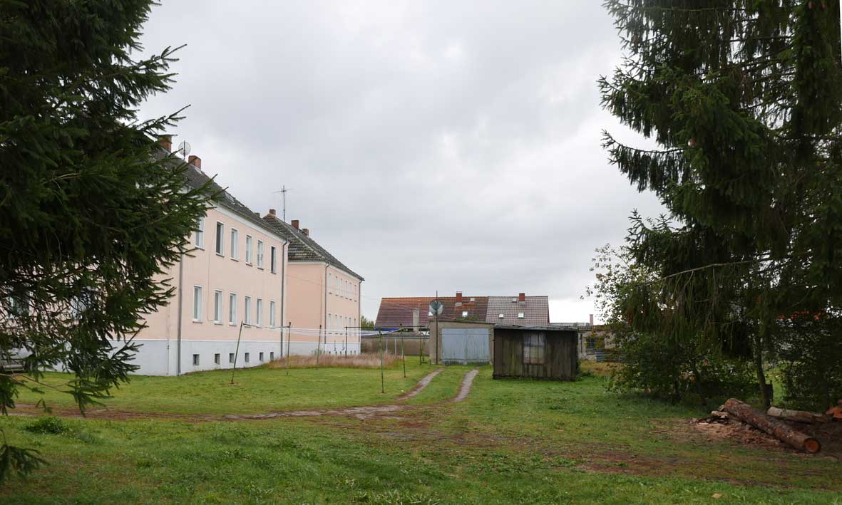 in den Park der ehemaligen Anlagen, links noch die Klein-Gärten des Dorfes nun, rechts die neuen Häuser heute mit ihren Gärten auch. Aber dazwischen hier wo das erste Gemeinschaftshaus der entsehenden LPG entstand wurde alles einer seltsamen Leere geopfert. Garagen und darum das graue Nichts. Wo doch Leben ist - und sei es aus den Garagen selbst.