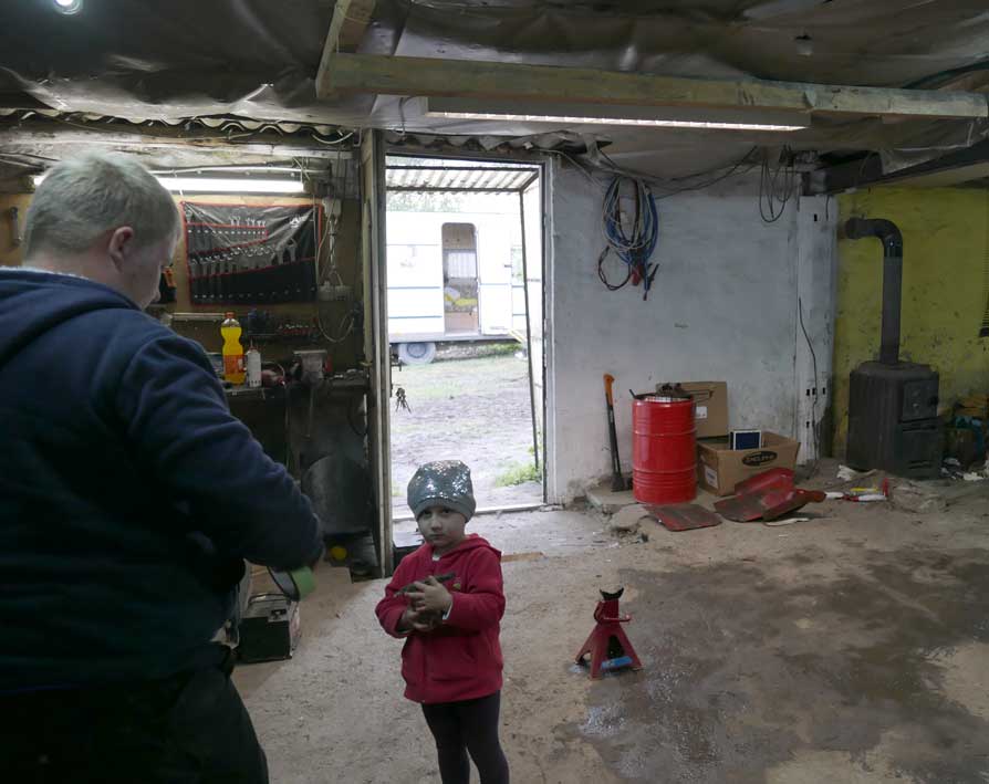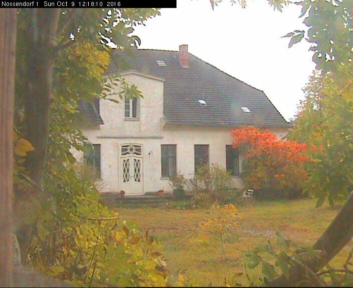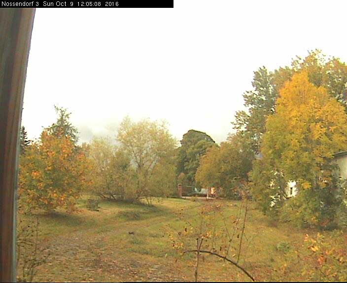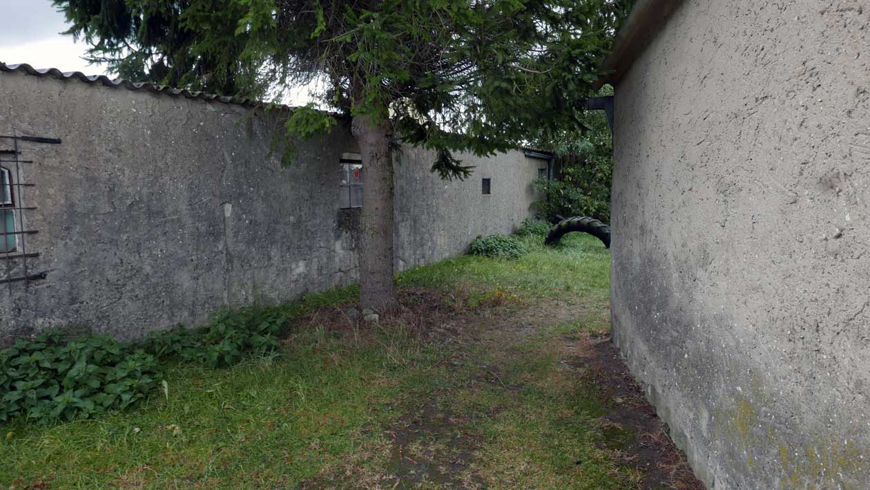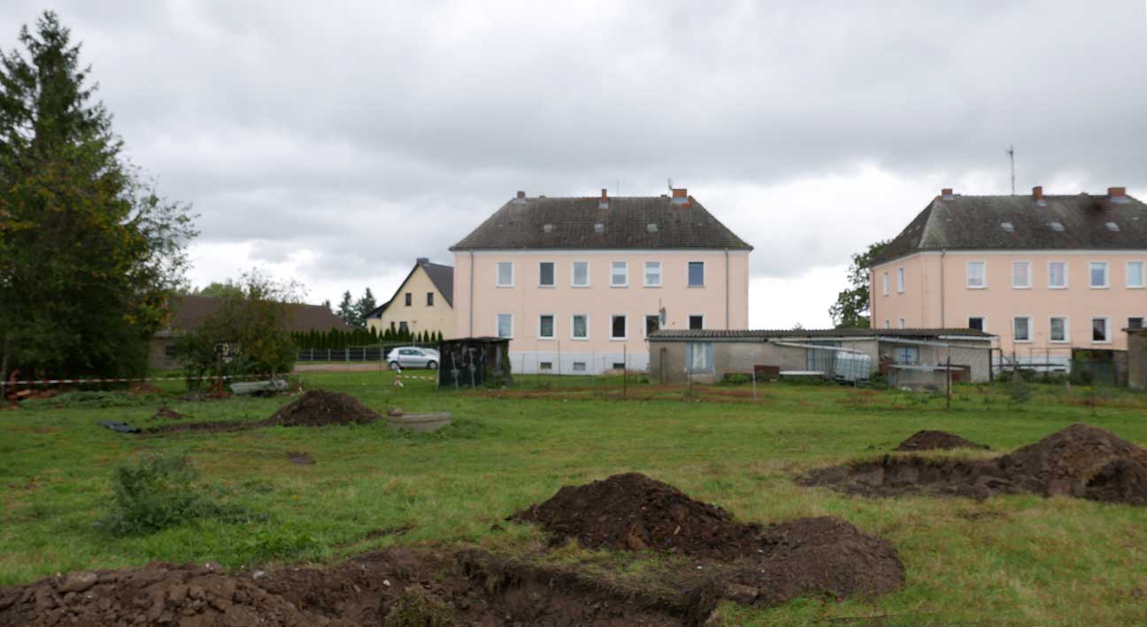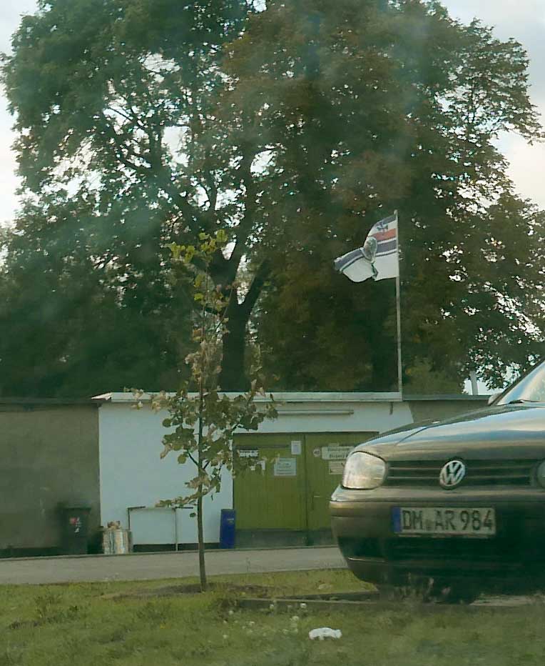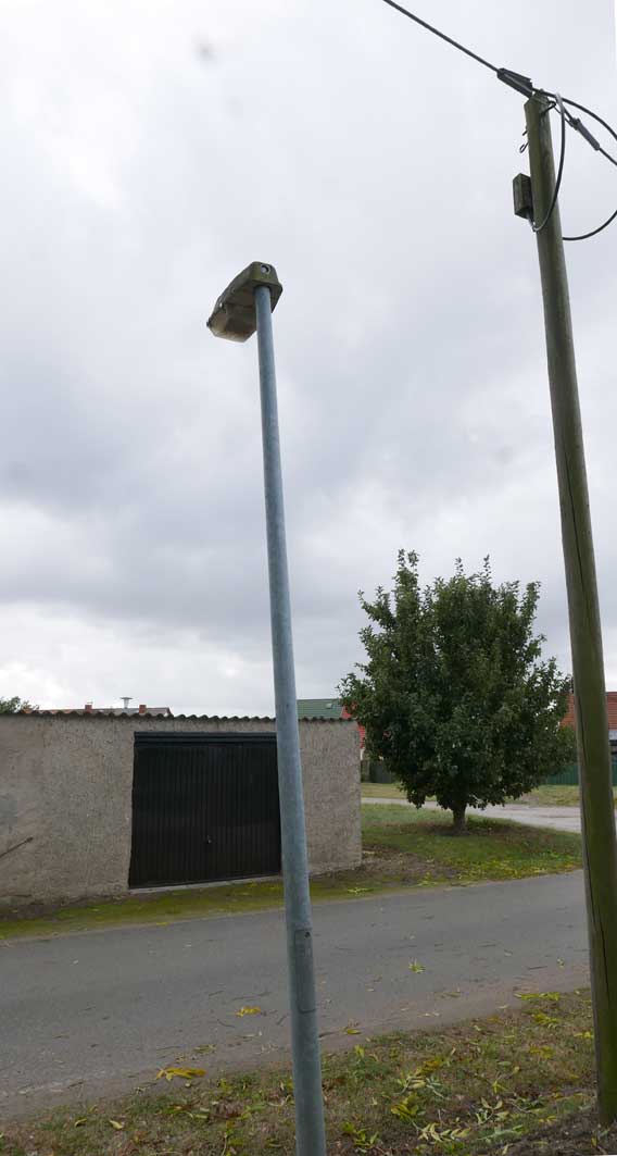 in den Park der ehemaligen Anlagen, links noch die Klein-Gärten des Dorfes nun, rechts die neuen Häuser heute mit ihren Gärten auch. Aber dazwischen hier wo das erste Gemeinschaftshaus der entsehenden LPG entstand wurde alles einer seltsamen Leere geopfert. Garagen und darum das graue Nichts. Wo doch Leben ist - und sei es aus den Garagen selbst.