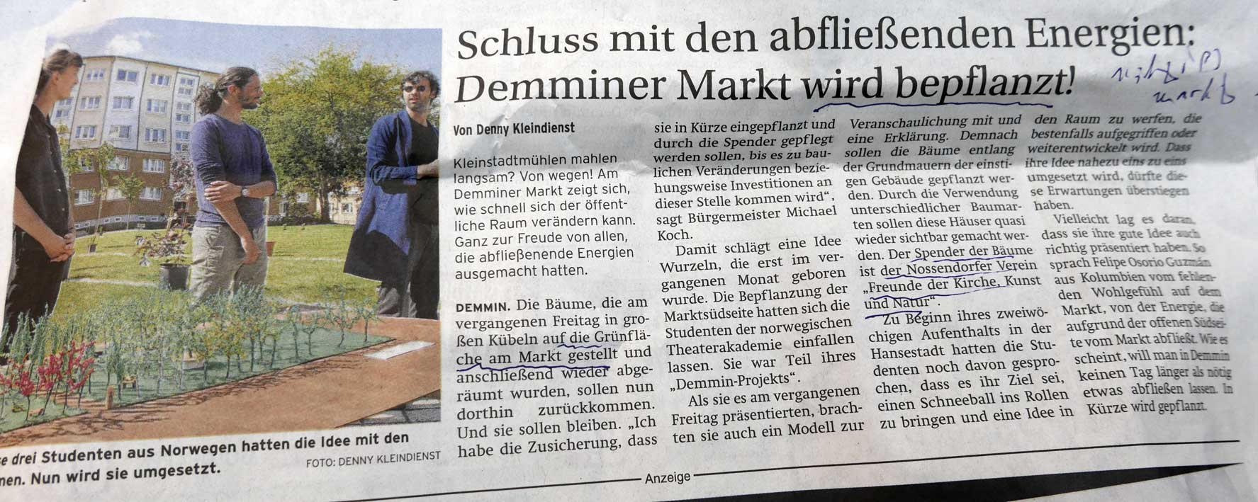 Vom Missverständnis der Demminer- Marktsituation im Modell eines begrünten Ruinenfelds am Markt als Park ist immerhin die ursprüngliche Idee der Baumallee am ehemaligen Kellergang mitten hindurch geblieben. Als Vorschlag nun mitten durch die Leere und hinüber zum querliegenden Plattenbau anstelle der MarktWand im Süden.