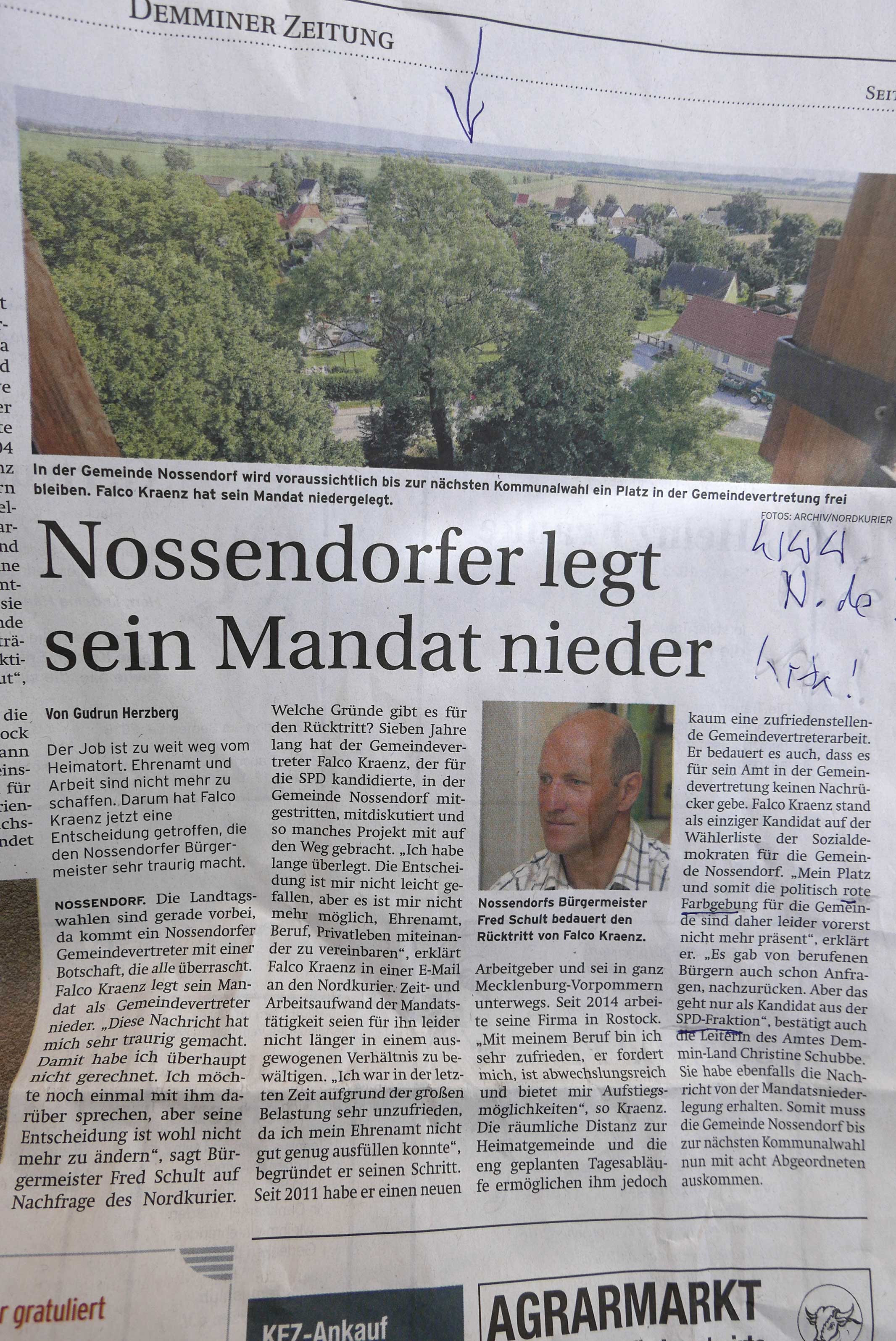 Der Abgang des stellvertretenden Bürgermeisters in Nossendorf gerade jetzt und die über grosse Markierung in der Zeitung markiert die Landflucht der jungen Leute und deren Fiolgen,