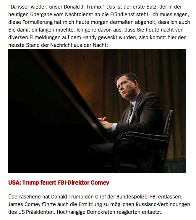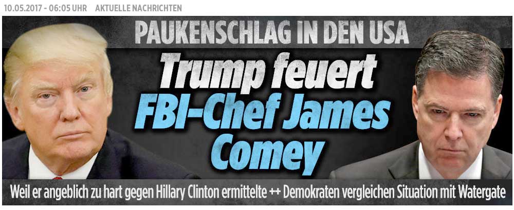 ich habe vom Generalbundesanwalt und seinem Stellvertreter die angehängten Briefe erhalten, die Ihre Entlassung als Direktor des Federal Bureau of Investigation empfehlen. Ich habe diese Empfehlung akzeptiert, Sie sind hiermit entlassen und werden mit sofortiger Wirkung aus dem Amt entfernt.