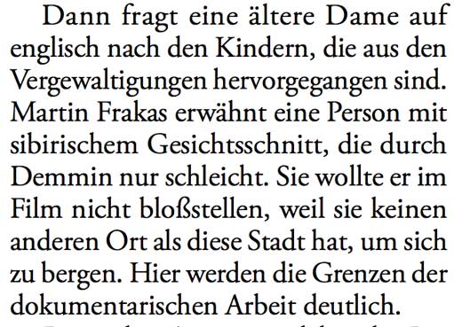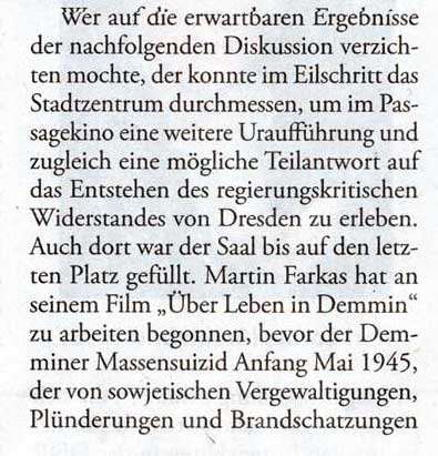 am selben Abend, in der Nacht als Demmin brannte, vergiftete Magda Goebbels ihre Kinder und nahm sich mit ihrem Mann das Leben. An den Sohn unter den Kämpfern irgendwo, schrieb sie den Grund. Es ist die häufigste Frage nach dem Film von M. Farkas in Demmin gewesen: Warum. Sie sagte es so.
