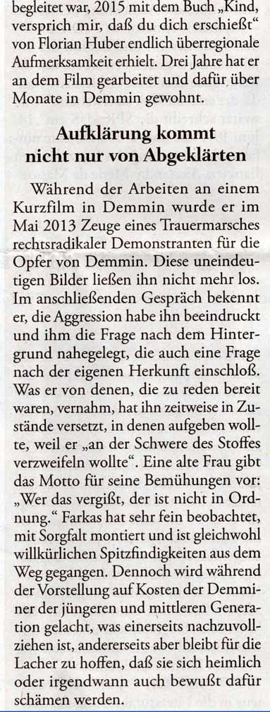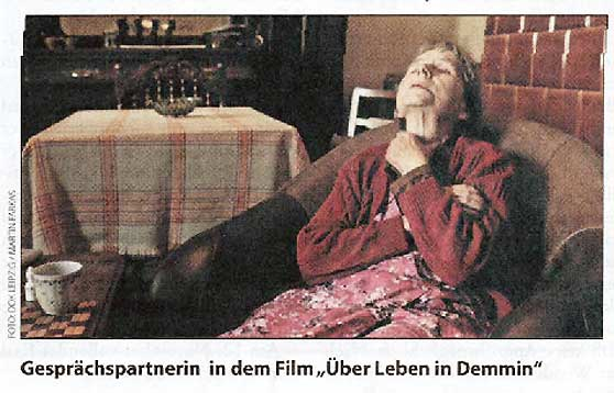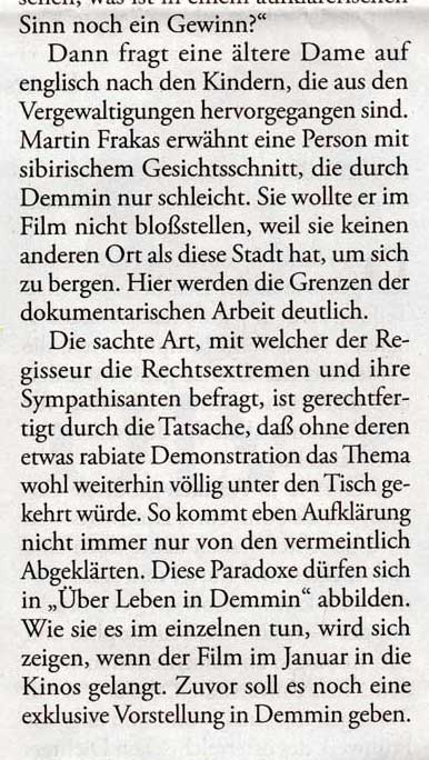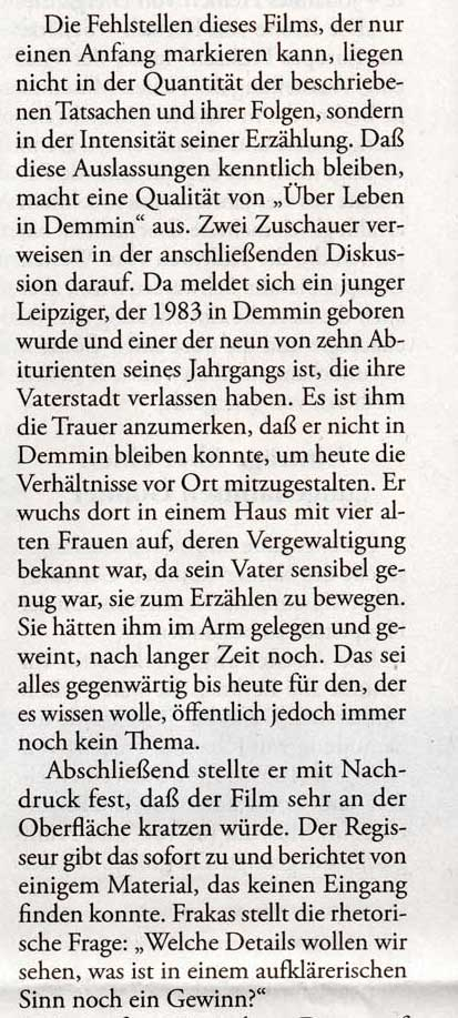 Dass ein Film oder sonstiges in Demmin im Panorama der deutschen Kulturrelevanz und Betriebsamkeiten nicht vorkommt ist sein Vorteil nicht von Betriebs- eineRoutine besetzt zu sein. Diese Apokalypse wartet noch immer auf ihre Entgegnung im Raum der Stadt.