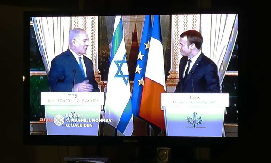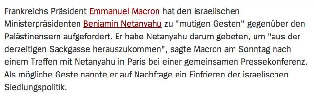 und dann sagt Netanjahu zum französischen Präsidenten: sehen Sie sind hier in Paris, weil Sie hier immer waren, so sind wir in Jarusalem nun, weil wir schon vor 3 000 Jahren dort waren.