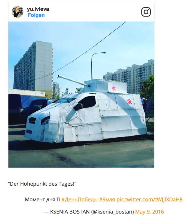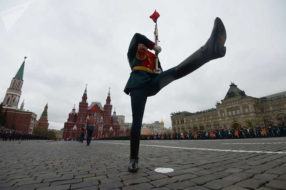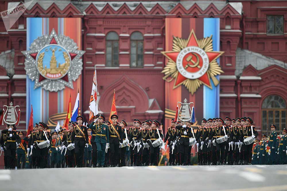 wobei das Lied „Der heilige Krieg“ gespielt wurde. Sie trugen die russische Staatsflagge und die Siegesflagge des Großen Vaterländischen Kriegs.