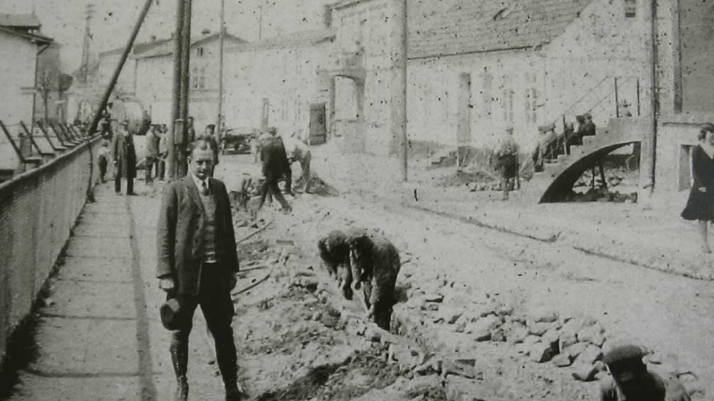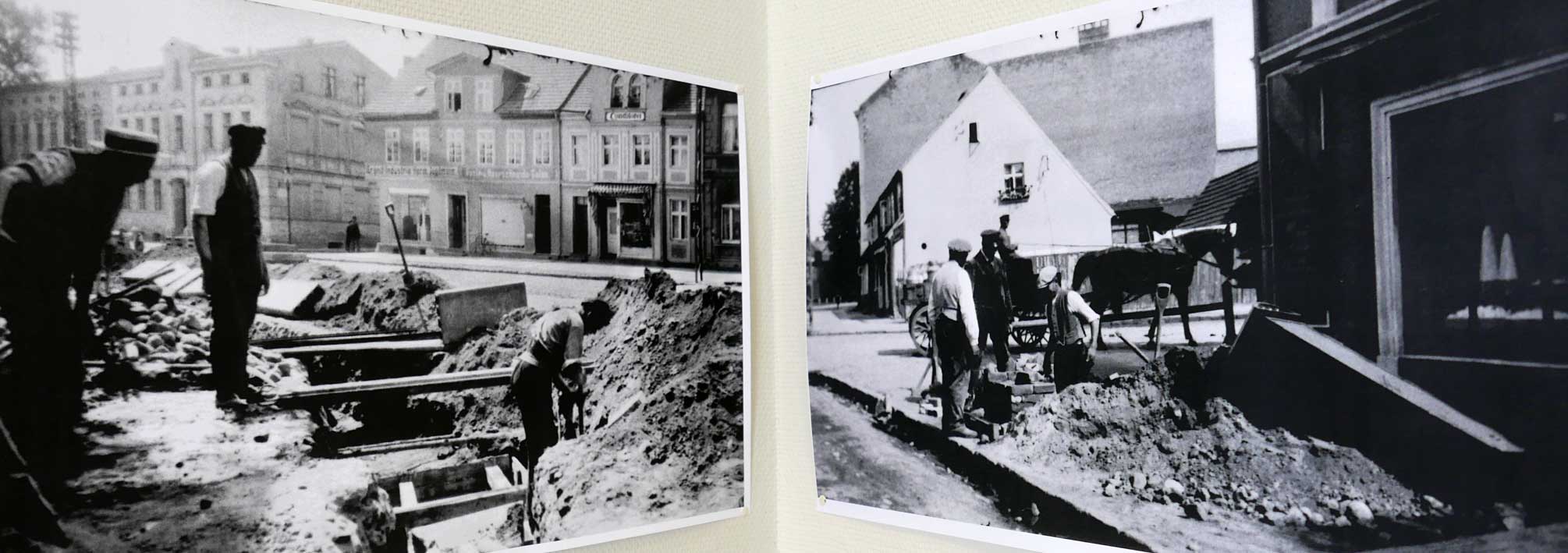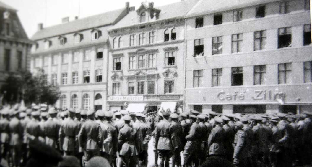Unter den Fotos, die alles selbst auf Platten zum Teil entwickelt und vergrösst wurden auch dies Bild vom Markt in den 20er Jahren. Mit dem Haus des Cafe Zilm und umgebauter Fassade ohne barocke Gliederung nach dem damaligen Stil der neuen Sachlichkeit ohne Stuckreliefs und dann nach dem Krieg ohne Mittel. Die Uniformierten wohl in der Ordnung linker Landwehr.