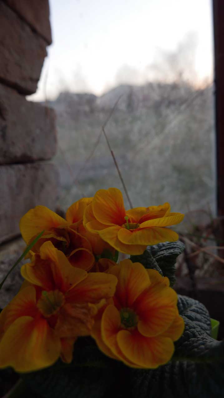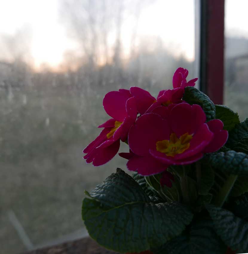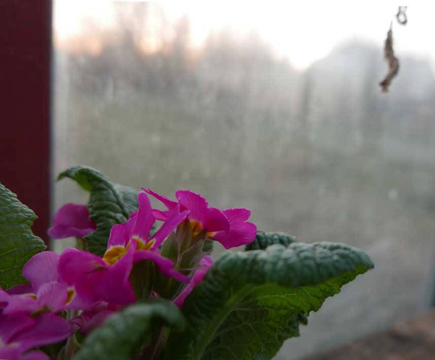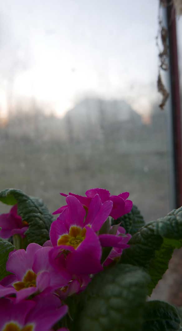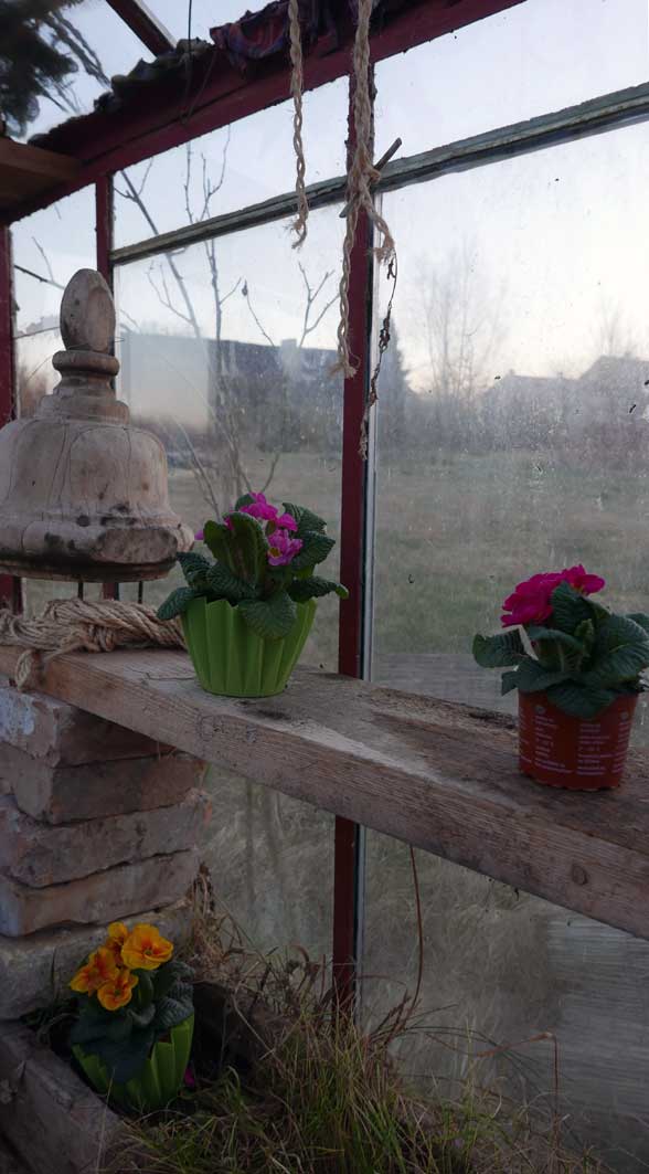 Das sind die ersten Primeln im fragilen Glashaus Rettung aus der Ermahnung an die Härten und Zerstörungen des Lebens - wächst ... auch?