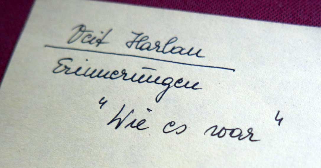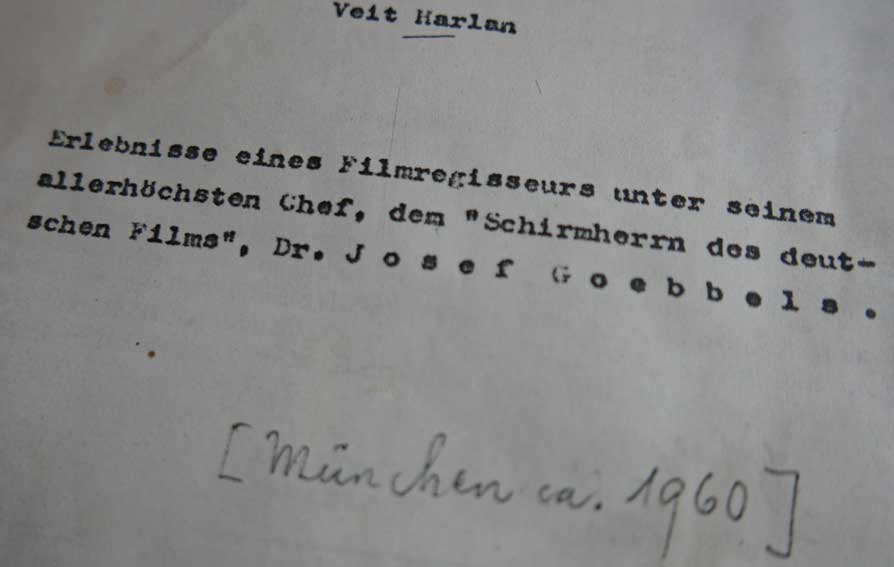 Befragungen der Memorien, von Veit Harlan, Kristina Söderbaum, des Orig. von V.H. hier im Haus, überlassen von K.S. Dann die Vorlage des Textes von Binding, aber davon Später. Zum Ende mit Göbbels wieder.