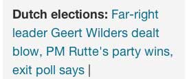 Auf Grundlage von 93 Prozent der Stimmen ergibt sich folgendes Bild: Die rechtsliberale Partei von Ministerpräsident Mark Rutte liegt mit 21,2 Prozent klar vorn. Danach folgt die Partei des Rechtspopulisten Geert Wilders mit 13,1 Prozent. Auf Platz drei liegen mit 12,6 Prozent die Christdemokraten. Knapp dahinter kommen die linksliberalen Democraten 66 mit 12,1 Prozent. DPA