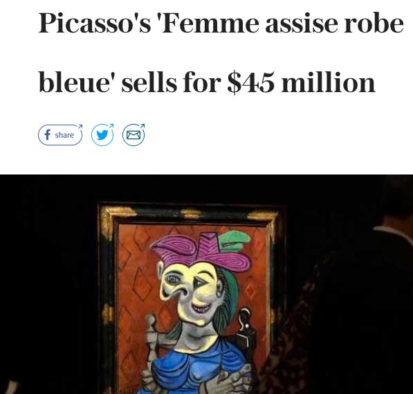New York - Das Porträt "Femme assise, robe bleue" von Pablo Picasso ist bei einer Auktion in New York für 45 Millionen US-Dollar versteigert worden. Das teilte das Auktionshaus Christie's mit. Das Gemälde aus dem Jahr 1939 stellt seine damalige Muse Dora Maar auf einem Stuhl dar. Die Nazis hatten es 1940 von Picassos Händler Paul Rosenberg in Frankreich beschlagnahmt. Widerstandskämpfer der Résistance hielten allerdings den Zug an, in dem das Bild nach Deutschland transportiert werden sollte, und stellten es sicher.