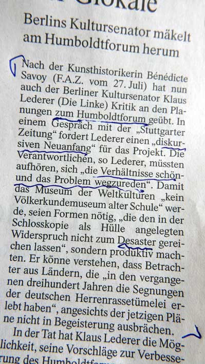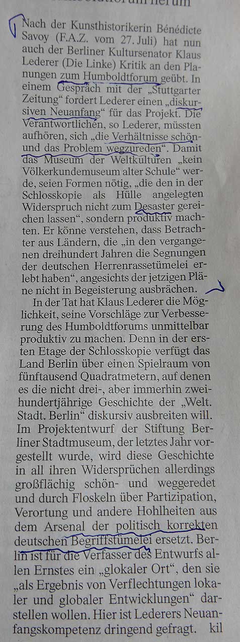 Und in der Hauptstadt, in Berlin. Täglich lesen, hören, sehen wir Proteste. Am zentralen Bauwerk . Von Stalin und seinem Büttel Ulbricht abgerissen. Nun als Anstrengung eines Nein zur Auslöschung von Geschichte als histische Maske für ein Gestell von heute vorgeschlagen. Füllen wir es mit dem, war heute sind, wollen, können. erfuhren und einzuladen an zentralerm Ort allen Gastgebend, aber mit neuer Form. Das Eigene. Vom Land her geistig fundamental, dass die Töne Raum werden und die Bilder zu durchschreiten sind.