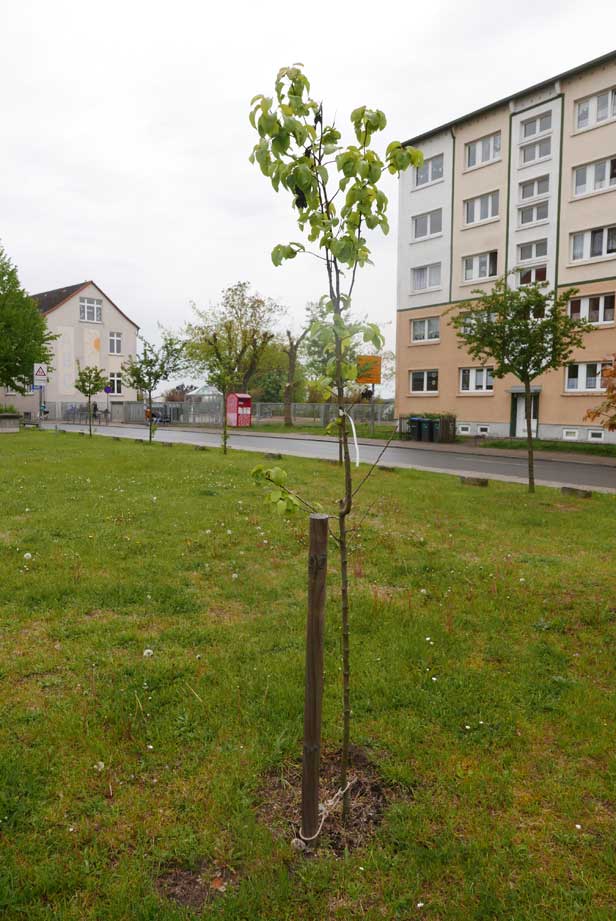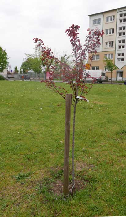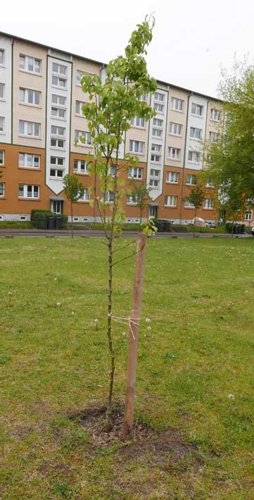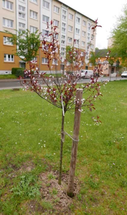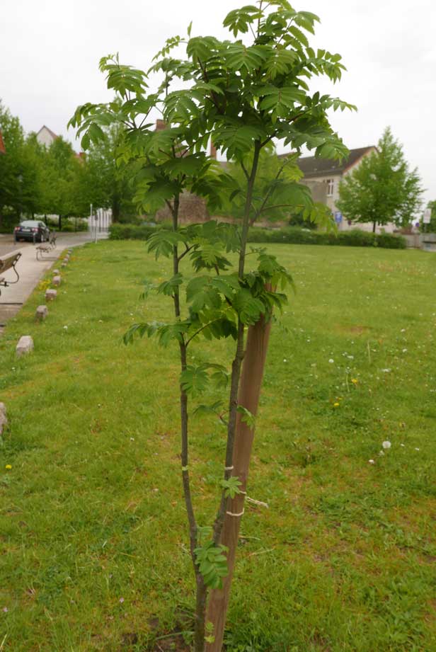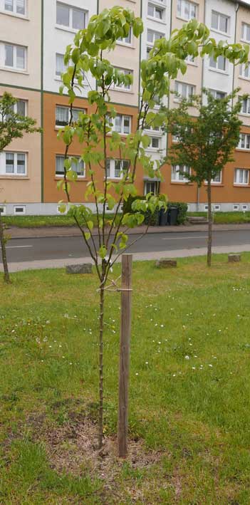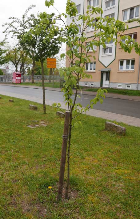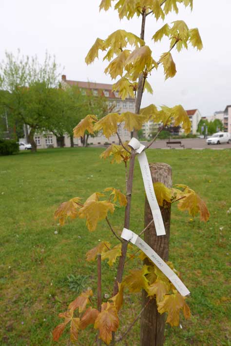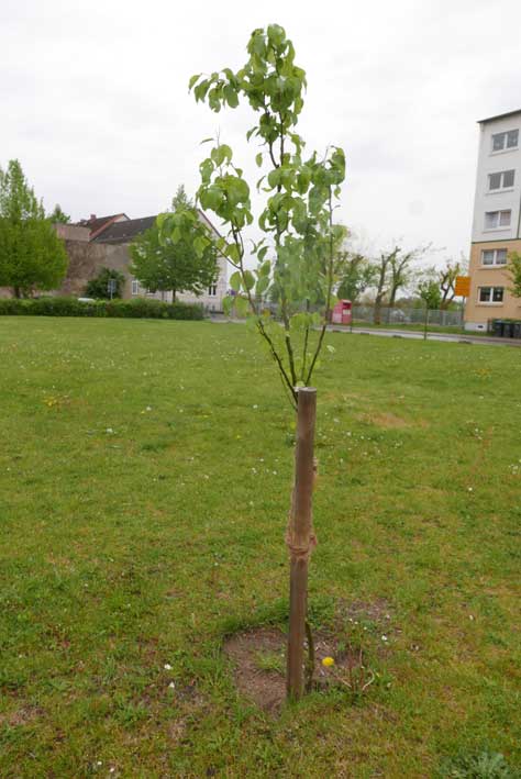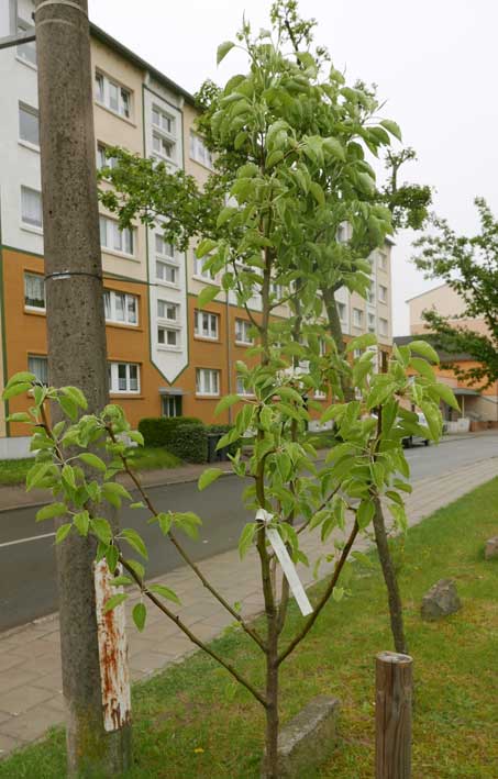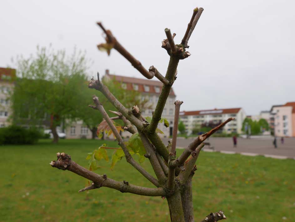 hier gabe noch im Herbst die mutwillen Beschädigungen. Der neue Austrieb mit sorgender Hand begleitet rettet den Baum.