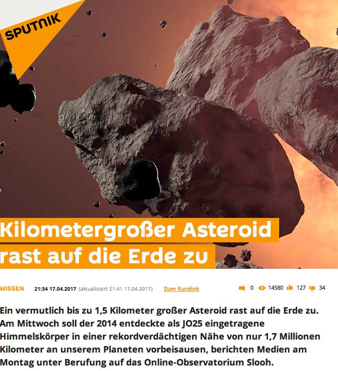 Bei minimaler Erdentfernung wird der Asteroid JO25 auch mit Hilfe von Amateurteleskopen gut sichtbar sein. Der Himmelskšrper steht auf der Liste der für die Erde potentiell gefährlichen kosmischen Objekte. Als eine gefahrlose Entfernung zwischen Asteroiden von solcher Grösse und der Erde gelten mindestens 7,5 Millionen Kilometer.