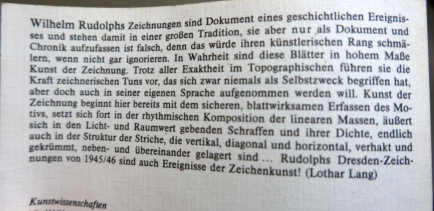Es sie der Menschen Natur auch etwas gut zu machen. So machte Wilhelm Rudolph der diese Bilder verfertigte sie gut. Verboten damals und nicht beachtet lange. Wie in einem Trieb, Furor des Todes, Verschwindens, schändens, süchtig stellen wir ihn vor. Einzig Bild um Bild sich selber auch als Antwort auf das was er sah sich behauptend.