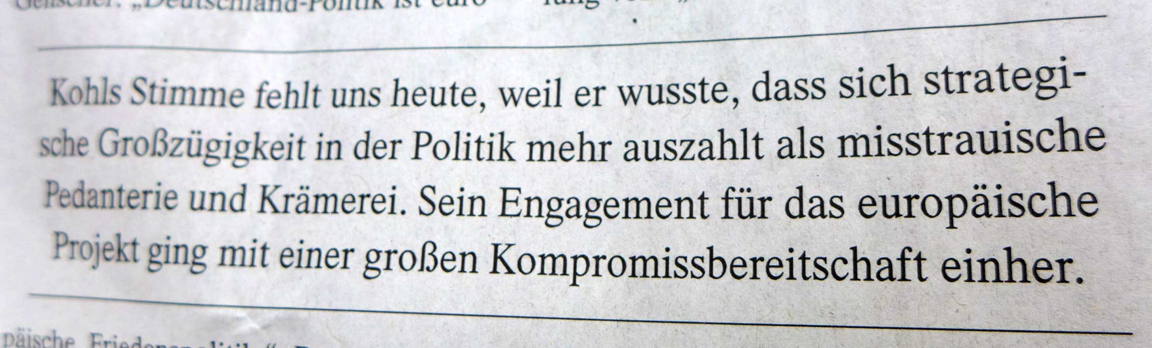 Er hat das Recht der DDR anerkannt, die Ent-Eignung von Land und Güter des ganzen Ostens anzuerkennen. Ohne die Not, wie er immer sagte und sagen liess, alle Gerichte nötigend von Karlsruhe bis Strassburg, es wäre von Russland gefordert, was die Unwahrheit war. Und dadurch schlimmes Unrecht anerkannt, tiefgereifend in der Kultur des Landes in aller Zukunft. Den Hass, der das bewirkte eingeladen nun zu überleben. Materiell bestätigt, was heute in der Hand ist des Kapitals und gieriger Beutemacher ist. Aber ideell aus dem Land eine Räuberhöhle nach 1945 gemacht mit Schuld auf einen Klasse geladen, die sie alle anging. Klassenjustitz vollzogen. Und die Frage steht im Raum, warum, wem zuliebe. Heut schwer zu heilende Wunde. Die Kultur zu retten in der Natur wiegt viel tausendfach schwerer als das materielle Unrecht.
