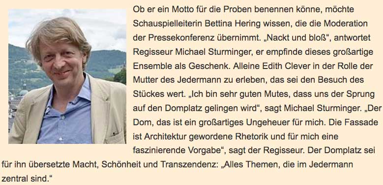 Alleine Edith Clever in der Rolle der Mutter des Jedermann zu erleben, das sei den Besuch des Stückes wert. „Ich bin sehr guten Mutes, dass uns der ...