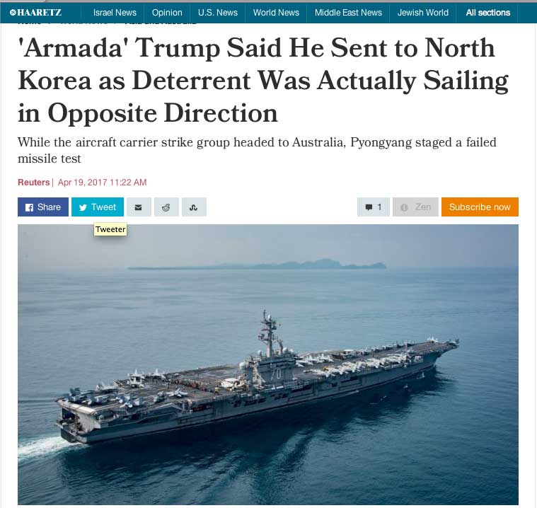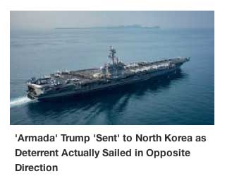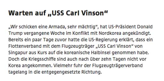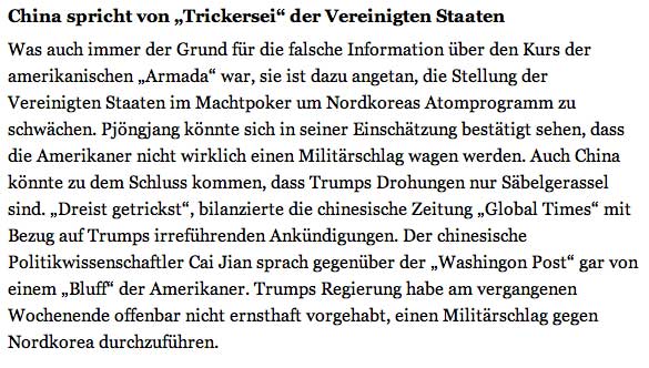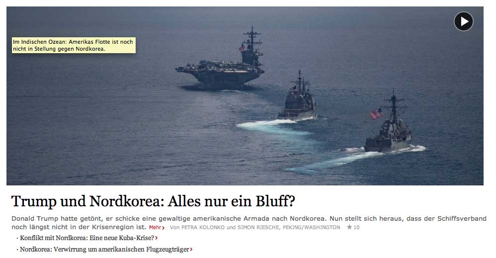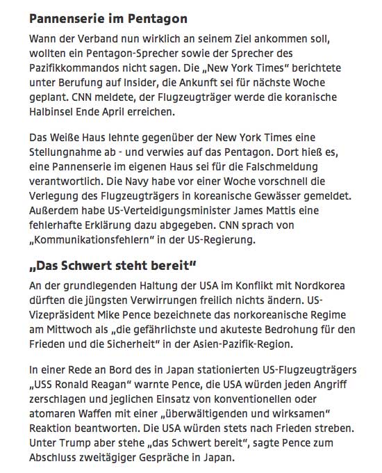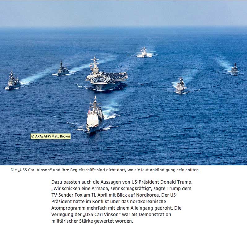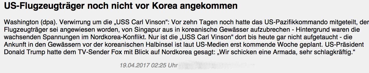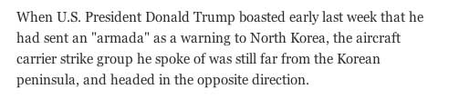 Eine "Armada" erhält den Befehl Richtung Korea zufahren. Es ist auszuschliessen, dass das ohne Wissen der Befehlshaber im Pentagon geschehen kann. Also Befehlsverweigerung. Widerstand, Verschwörung, Revolte, Meuterei nennt man das zu Wasser. Auch dass das oval office davon nichts wusste, ist unwahrscheinliuch. Also auf höächster Ebene. Ohne Verfolgung ohne Kommentierung in der Pressen,unter Zurückhaltung der beobachtenden Länder (Russland, Sputnik ohne Meldung).