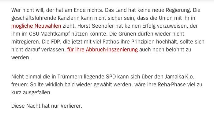 Ihr Sprecher trat zuweilen mit Backenmikros auf, die grösser waren als seine Augen. Die Partei sollte den Vorsitzenden wechseln, sonst ist sie raus. Letzte Meldung gestern nachmittag, nach neuesten Umfragen, die einzige der 4 VerhandlungsParteien, die Stimmen verlor. Sie hatten noch mal eine Chance. Aber man stelle sich vor so einer hätte ein regierendes Amt übernommen.