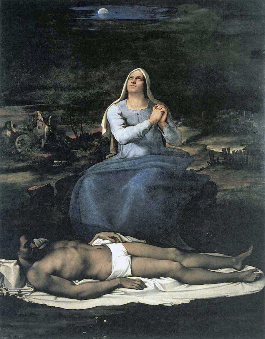 Und die Frau, Hände ringend, -die ihm der Meister gezeichnet- in wüster Landschaft, Mutter vor dem Toten, den sie ihr hingelegt zur Klage, nächtlicher Einsamkeiten der Welt. Unserer.