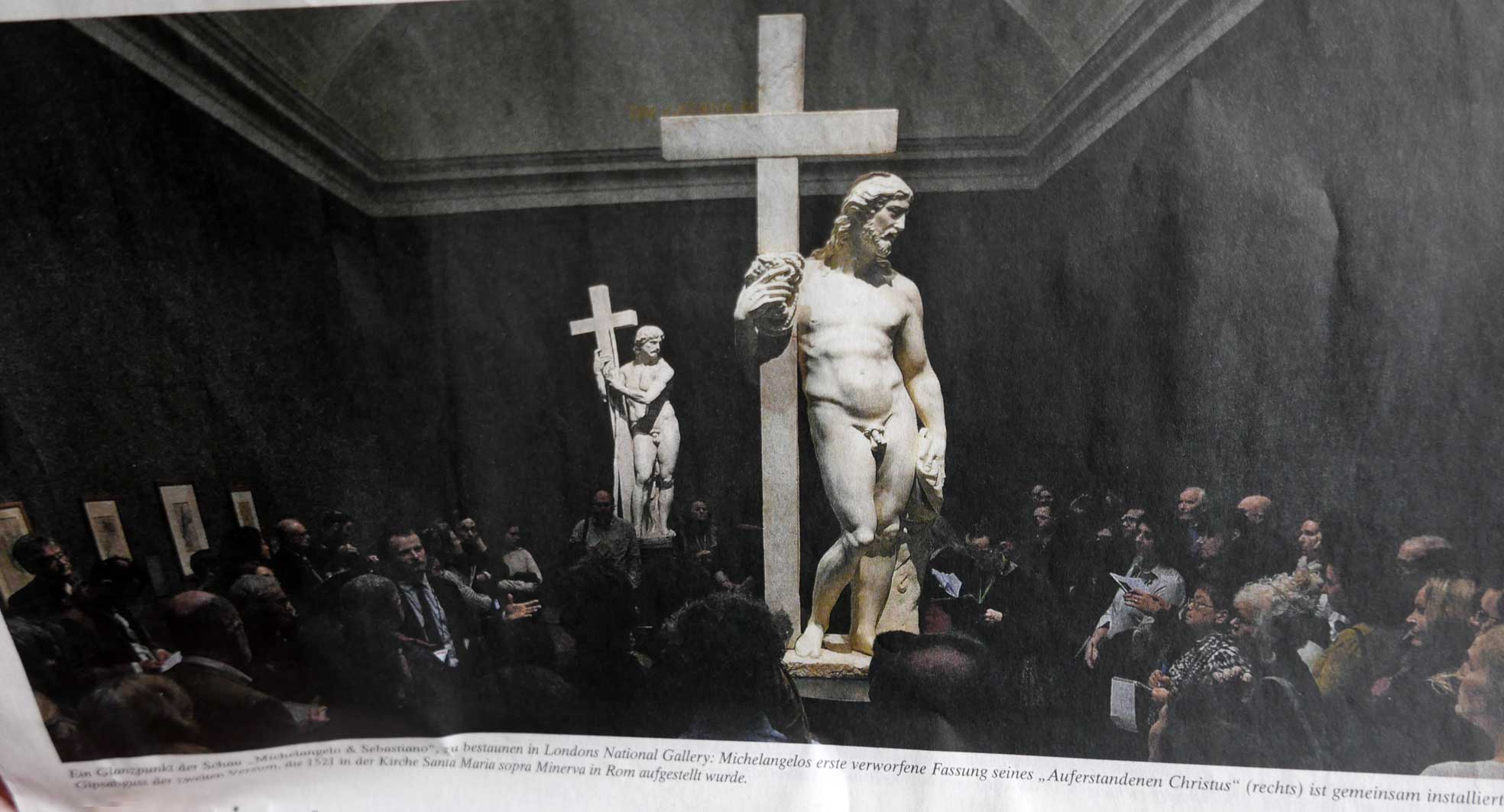 In London gibt es zur Zeit eine Ausstellung zu Michelangelo und Sebastiano del Piombo. Und die Menschen der Eröffnung kammen zusammen, als sei es das erste Mal zu sehen, was hier sonst auch an anderen Ort nun zusammen zu sehen ist. Und solcher Art mitten unter uns. In dunklem Raum, abgehängt und zu umgehen. Von allen Seiten.