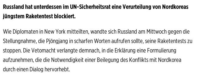 Der Uno-Sicherheitsrat hat den jŸngsten Raketentest Nordkoreas nun doch scharf verurteilt. In einer am Donnerstag veršffentlichten Mitteilung hie§ es, die Mitglieder des Gremiums behielten sich "weitere bedeutende Ma§nahmen inklusive Sanktionen" vor. Sie hŠtten sich darauf geeinigt, die Situation weiter eingehend zu beobachten.Zuvor hatte es Unstimmigkeiten darŸber gegeben, warum die ErklŠrung nicht schon frŸher veršffentlicht worden ist. Russland hatte von seinem Veto-Recht Gebrauch gemacht, weil sich der Wortlaut des von der US-Delegation eingebrachten Entwurfs sich von frŸheren ErklŠrungen des Sicherheitsrats zu nordkoreanischen Raketentests unterschieden habe. Insbesondere habe der Aufruf zu einer Lšsung des Konflikts "durch Dialog" gefehlt. Die USA, die derzeit dem Sicherheitsrat vorsitzen, hatten die ErklŠrung aufgesetzt. Der russische UN-Botschafter Petr Iljitschew warf der US-Delegation vor, sie habe den Beschluss "abrupt" durch den Sicherheitsrat bringen wollen.
