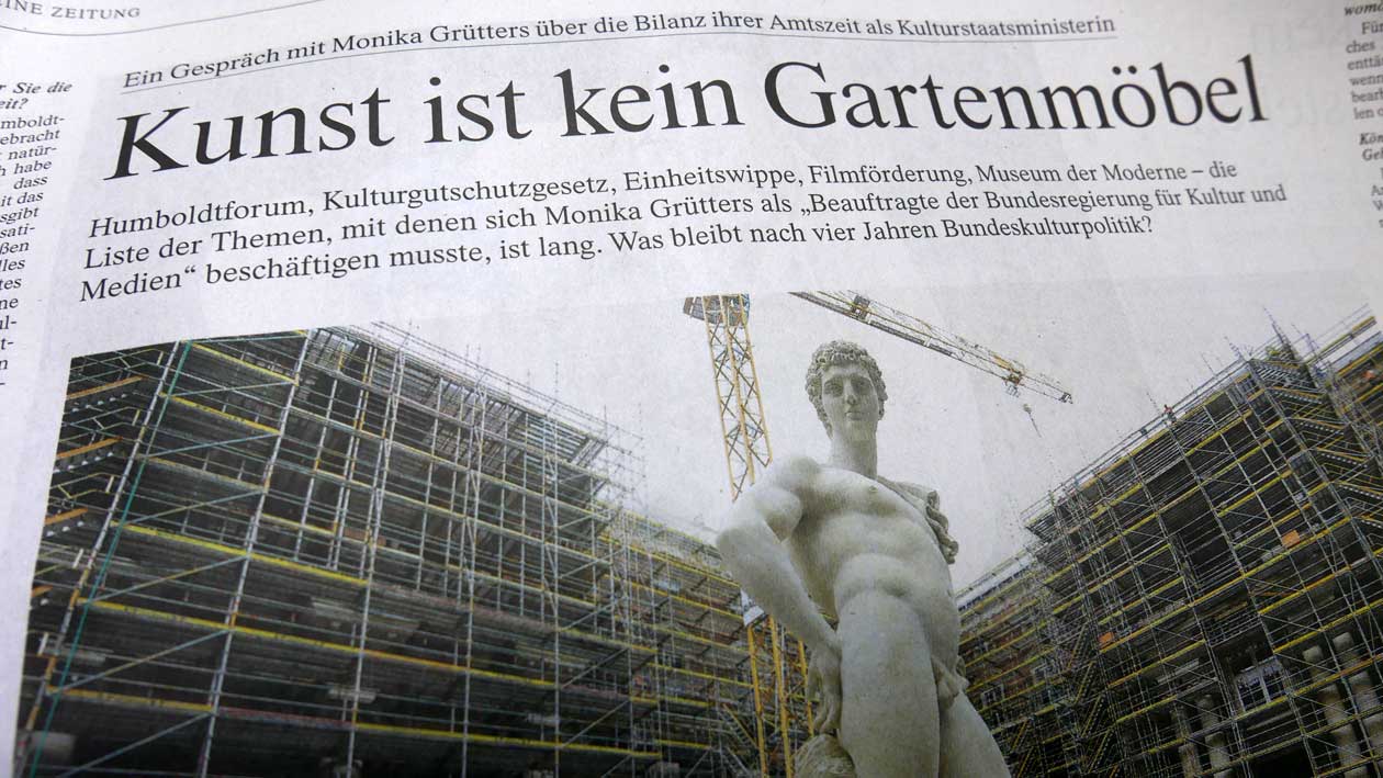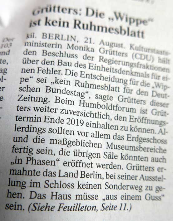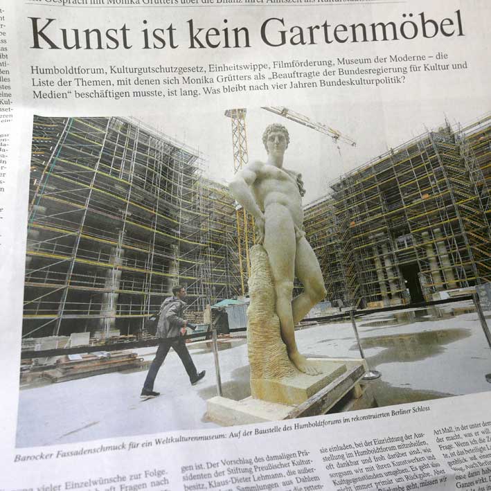 Die mit dem Schlossbau Berlin hauptsächlich beauftragte Staatsministerin im Kanzleramtzieh Bilanz ihrer 4 Jahre vor der nächsten Wahl worin den Zentralen Punkt wieder dieser Bau einnimmt.