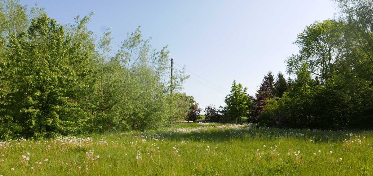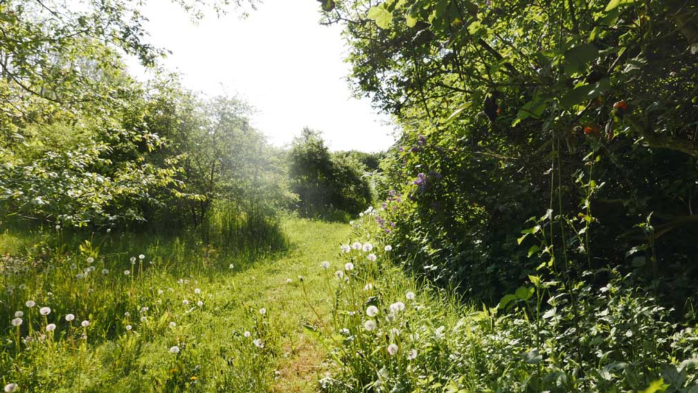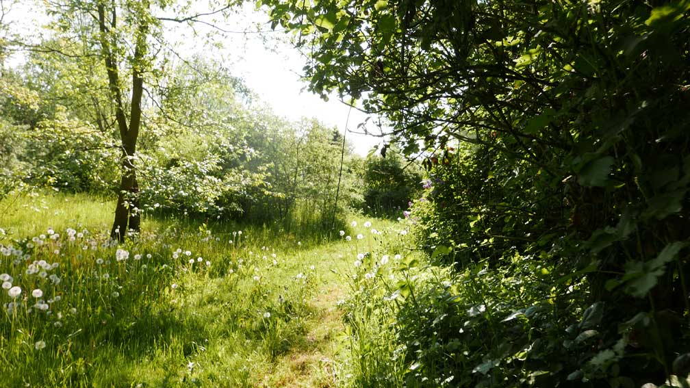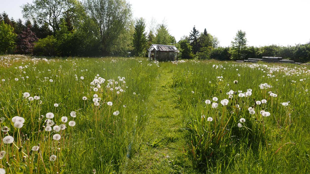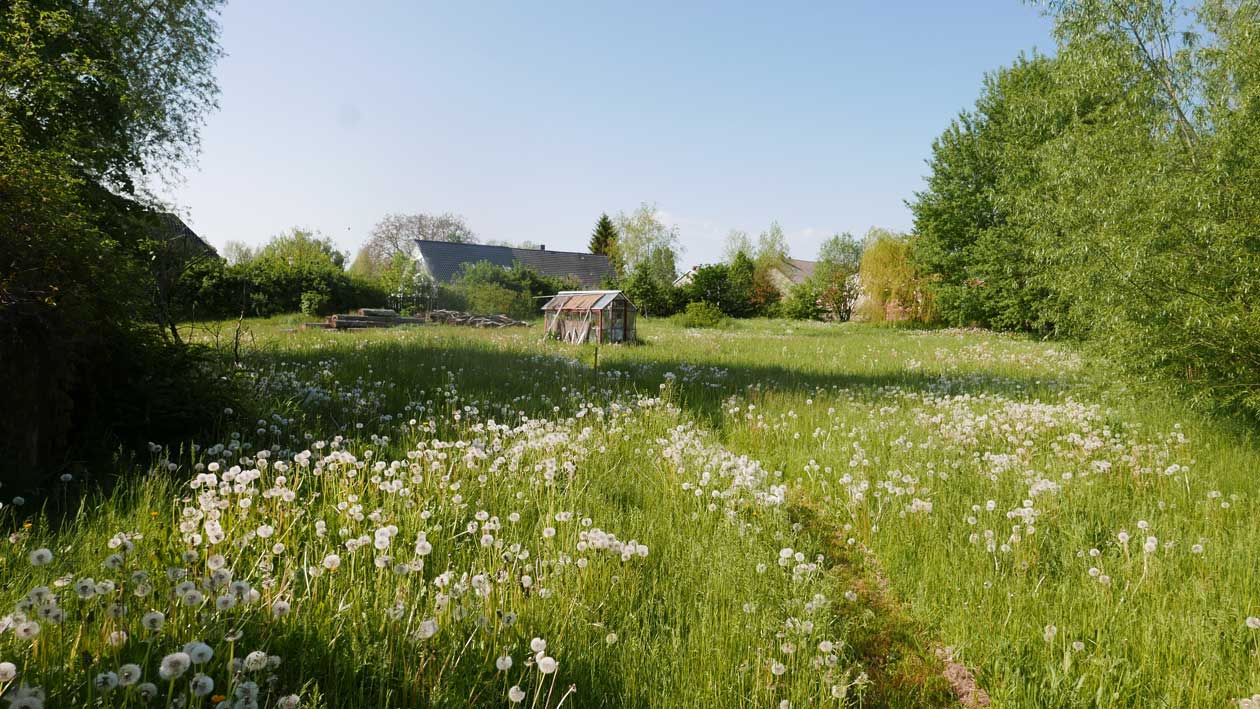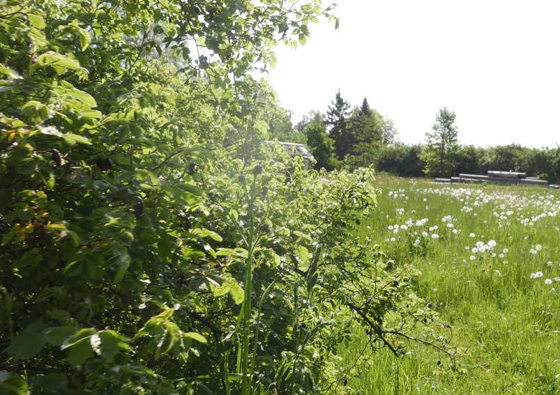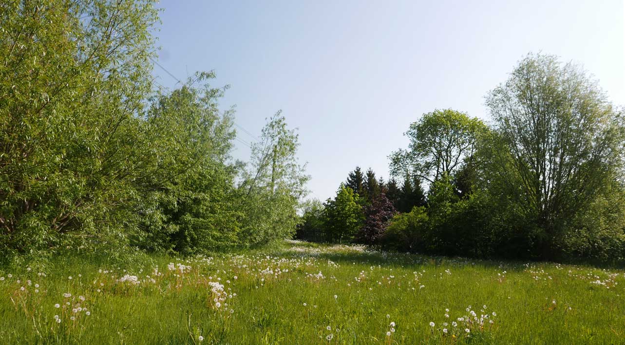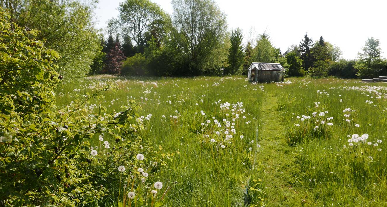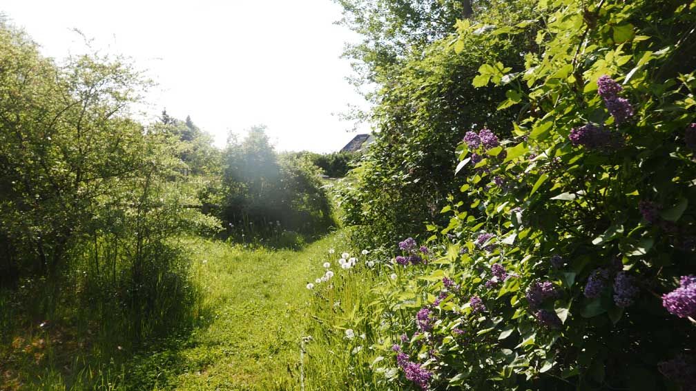 der Blick vorbei an der Blumenwiese links, wo nicht gemäht wird