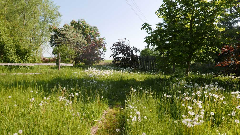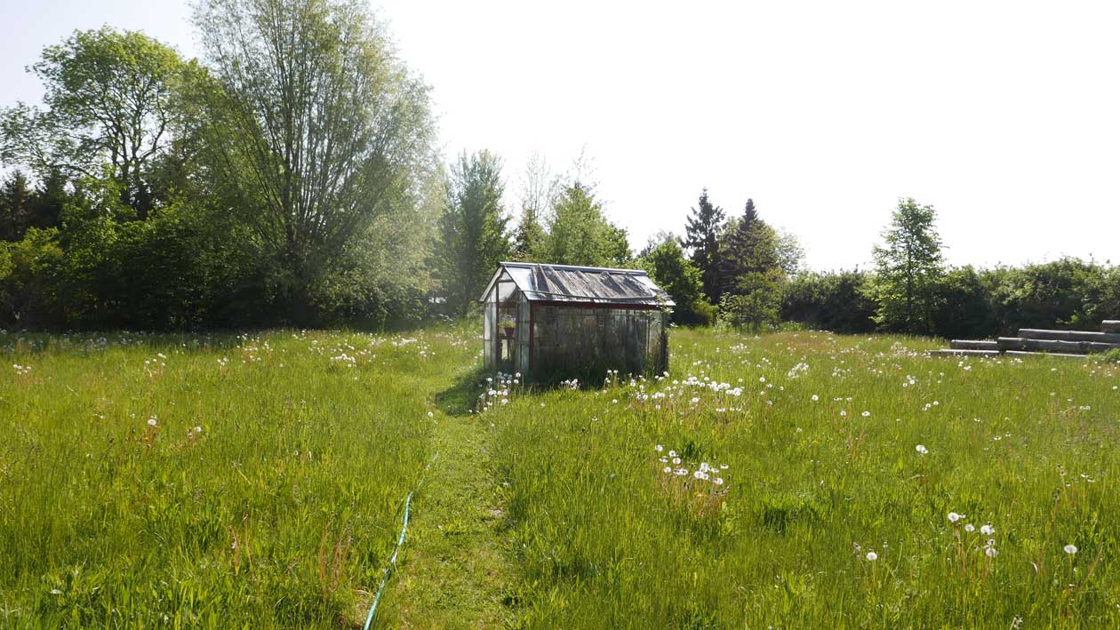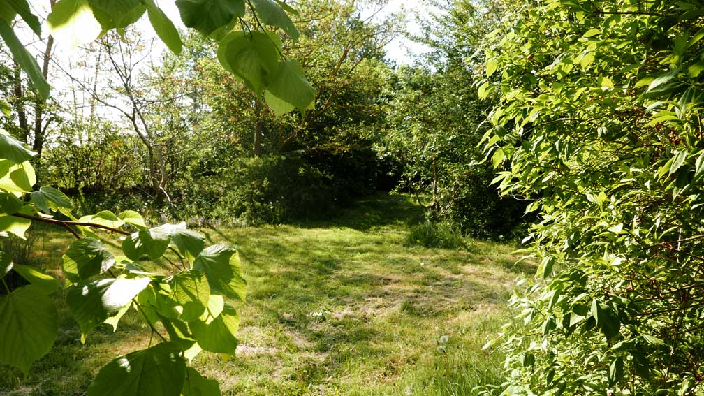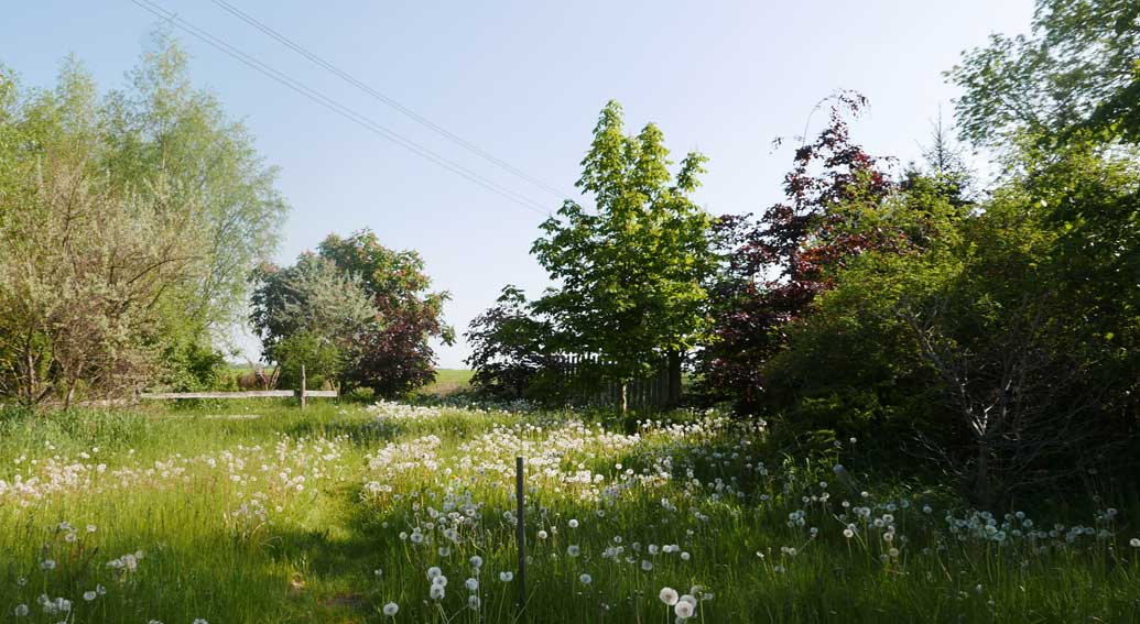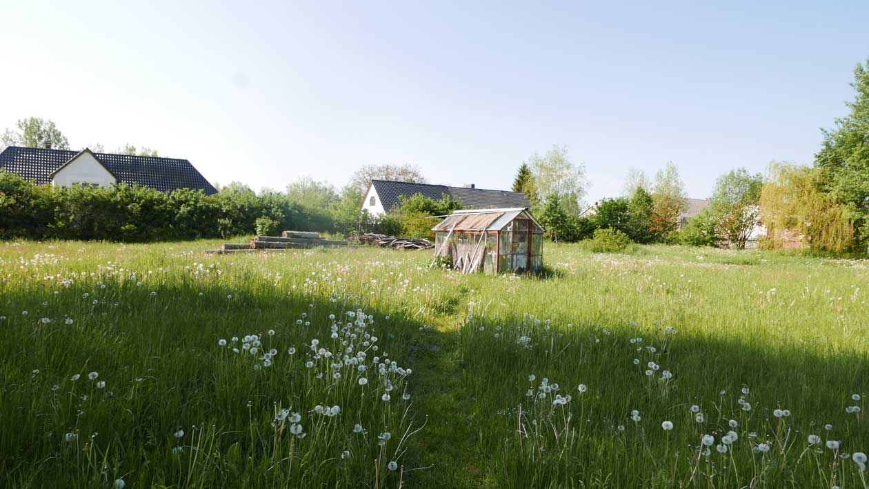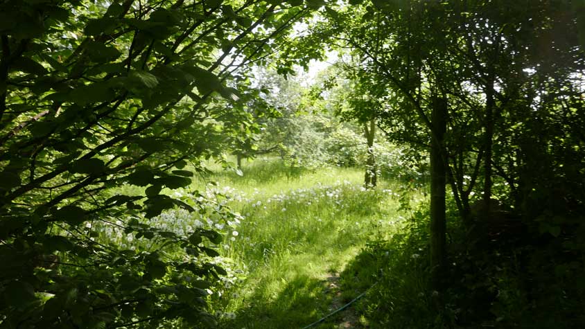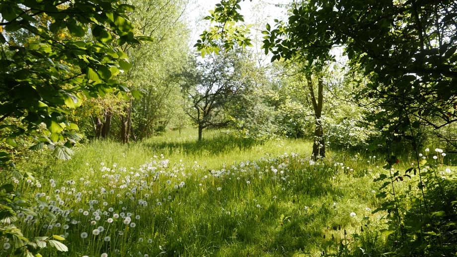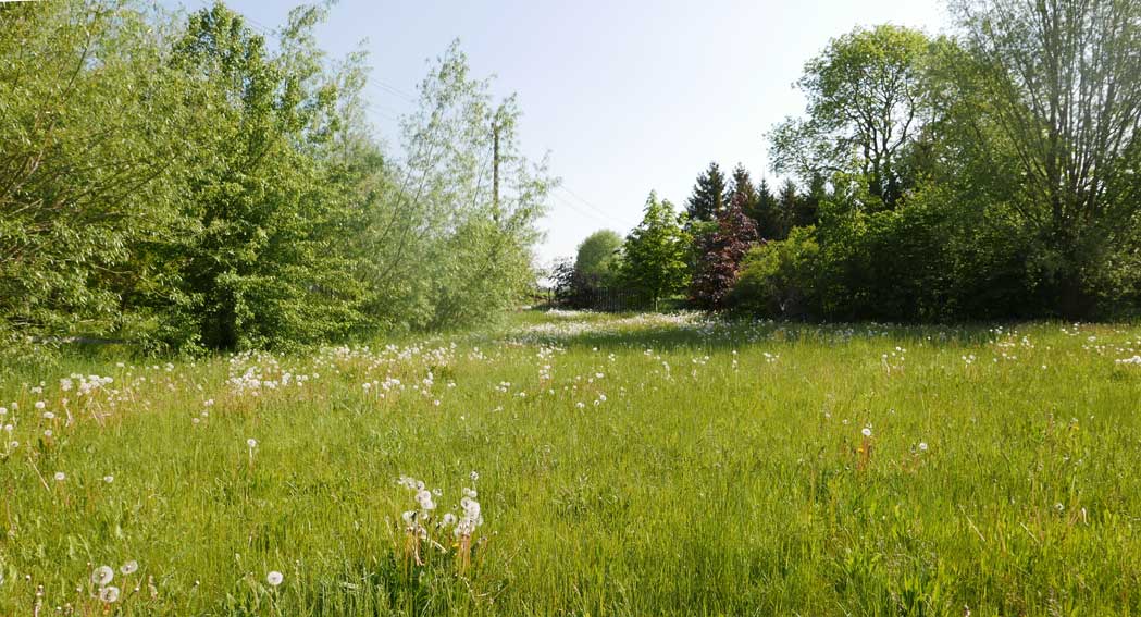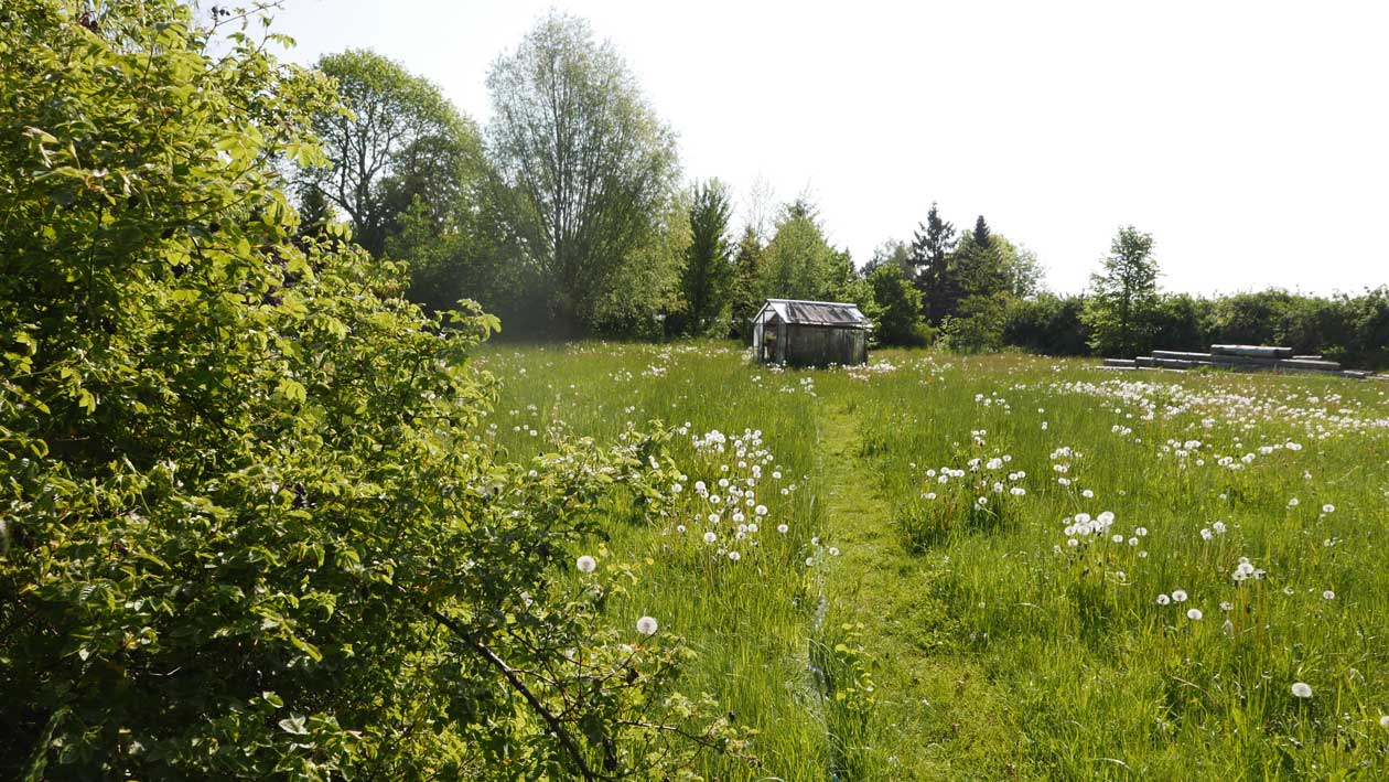 der Blick vorbei an der Blumenwiese links, wo nicht gemäht wird