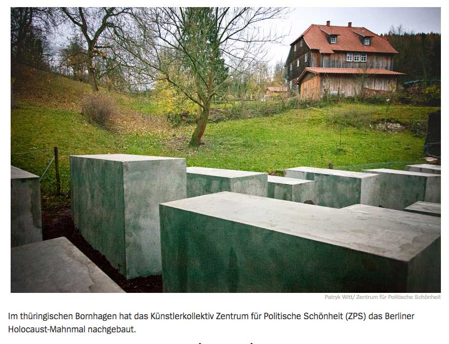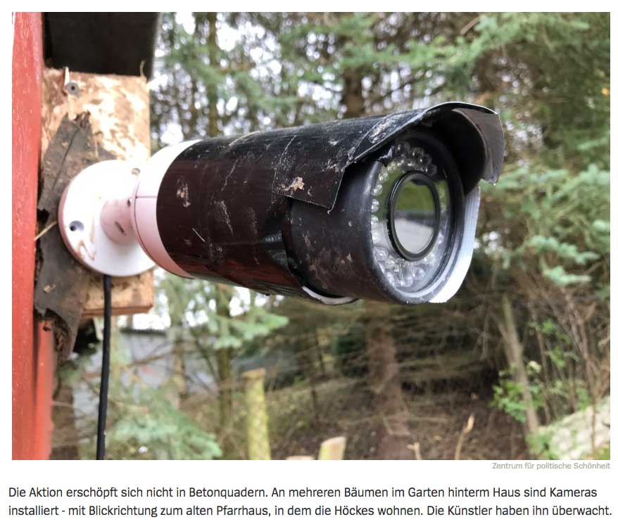 An mehreren Bäumen im Garten hinterm Haus sind Kameras installiert - mit Blickrichtung zum alten Pfarrhaus, in dem die Höckes wohnen. Im ZPS-Unterschlupf gibt es auch ein Zimmer, rechts neben der Haustür, das sie "Überwachungsraum" nennen. Sechs Bildschirme sind darin auf- und nebeneinander gestapelt, auf dem Tisch liegen zwei angebissene Waffeln auf einem Teller. Künstler, die Politiker überwachen?