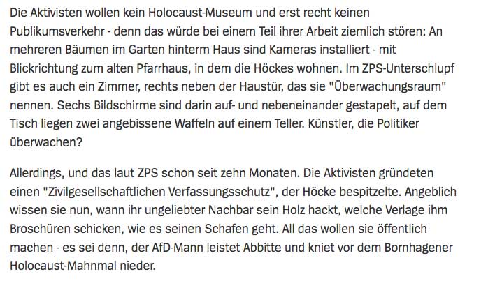 Allerdings, und das laut ZPS schon seit zehn Monaten. Die Aktivisten gründeten einen "Zivilgesellschaftlichen Verfassungsschutz", der Höcke bespitzelte. Angeblich wissen sie nun, wann ihr ungeliebter Nachbar sein Holz hackt, welche Verlage ihm Broschüren schicken, wie es seinen Schafen geht. All das wollen sie öffentlich machen