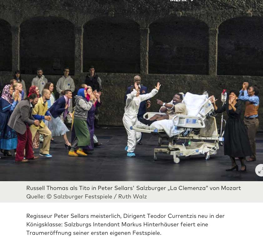 In Salzburg, gleich hinter der Grenze, haben sie jetzt einen Mozart in seiner letzten Stunde entdeckt, der nicht mehr so ganz auf der Höhe der Zeit war. -in der Oper Der Tränen des Titus, als Ermahnung an die Aufgabe der Gnade. Und das in der Zeit der franz. Rev. mit den politischen Morden als Waffe-. Weshalb sie nun eine neue Geschichte drunterlegten als Rettung aus unserer Zeit: mit Flüchtlingen und Krankenbetten des Todes, und wo die Musik nicht passte, indem sie neue dazutaten. Der Beifall zeigt die Armut ihres Verfalls.