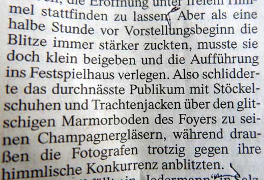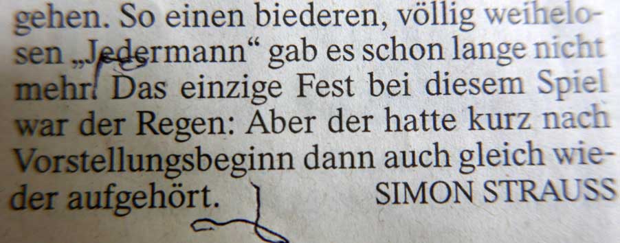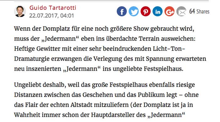 zurück zum JEDERMANN in Salzburg, dem Umzug vom Domplatz ins Theater der Festspiele wegen Regen und Gewitter. Mit Nachrichten aus dem Inter Net.