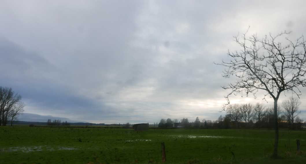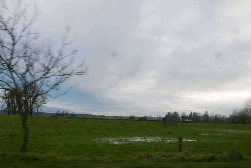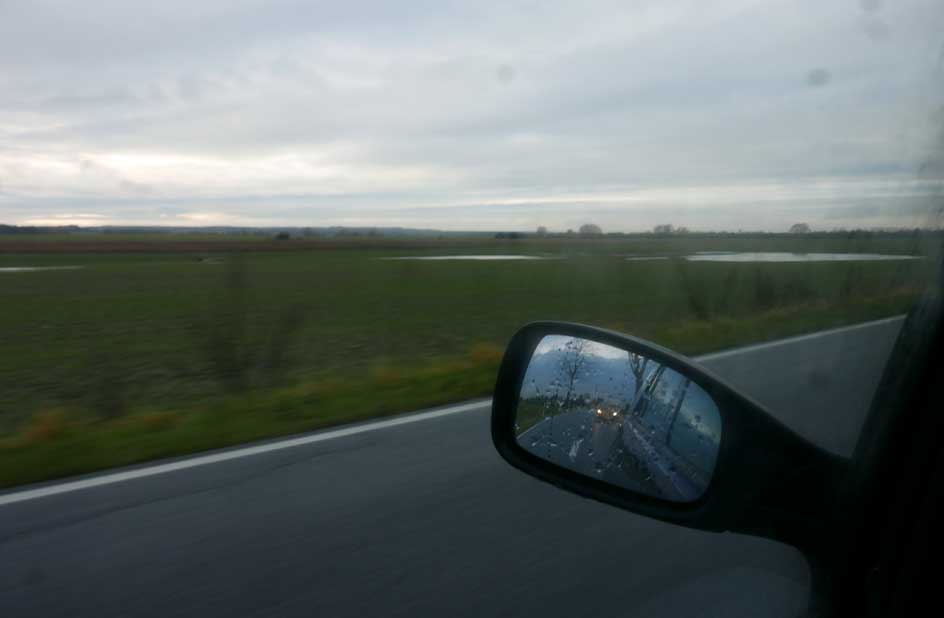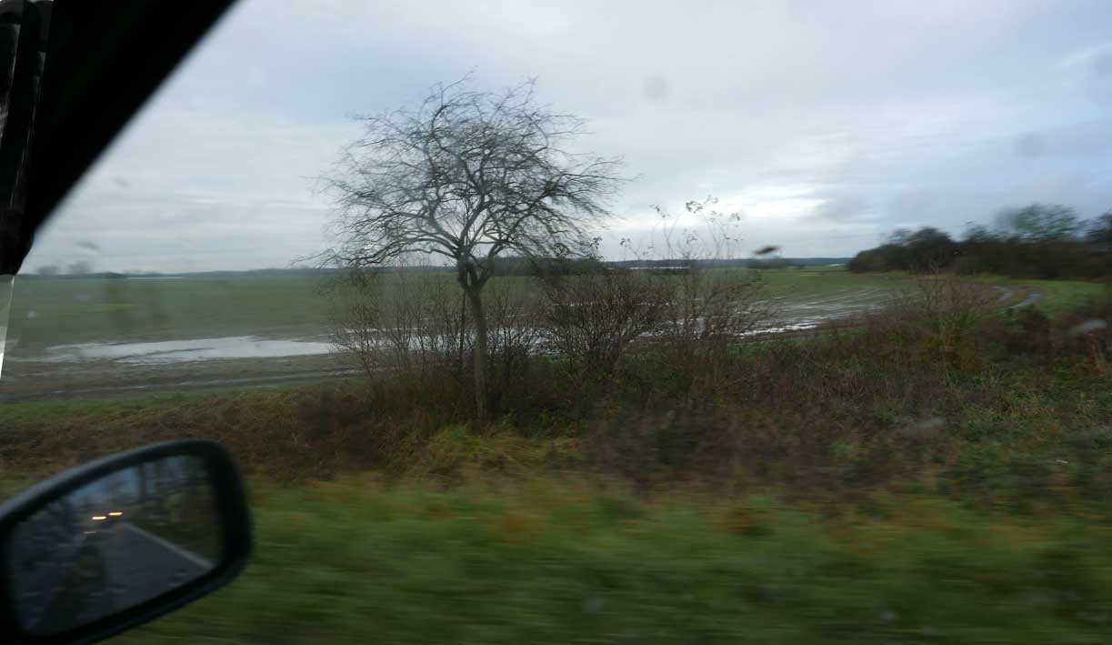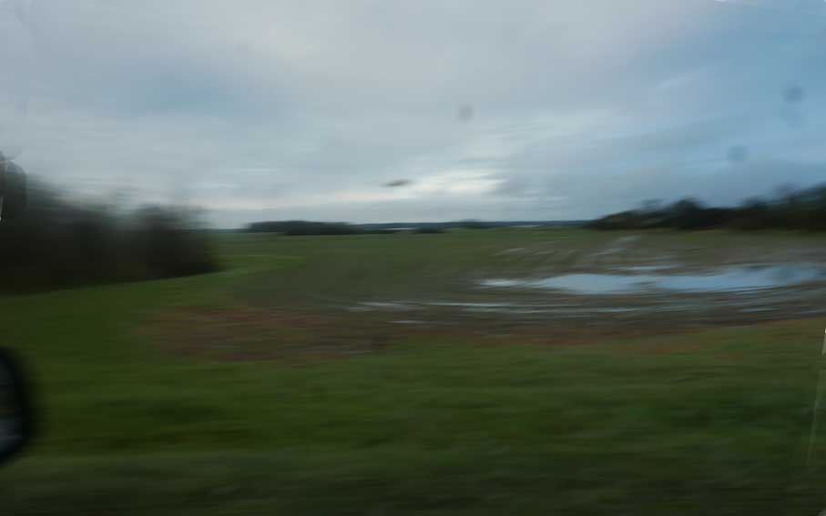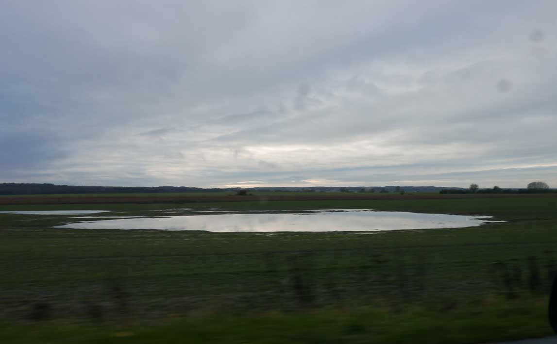 über Land gefahren nur Regen jetzt und viel Wassen auf den Feldern und Wiesen