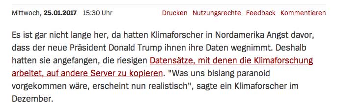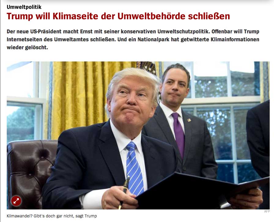 Doch die Optimisten haben sich getŠuscht. Denn Trump plant offenbar, die Webseiten zum Klimawandel der US-Umweltbehšrde EPA (Environmental Protection Agency) oder zumindest Teile davon zu schlie§en. Das haben zwei Mitarbeiter der Einrichtung der Nachrichtenagentur Reuters mitgeteilt. Sie wollen namentlich nicht genannt werden, da es ihnen verboten sei, mit Vertretern der Presse zu reden, meldete die Agentur.