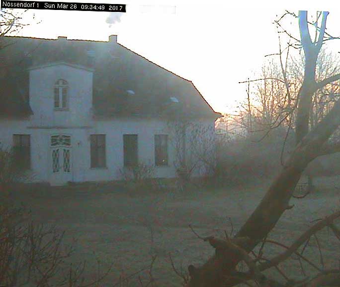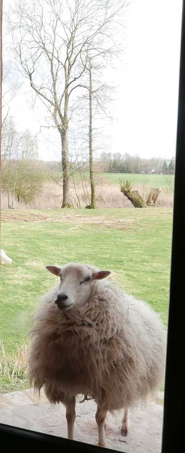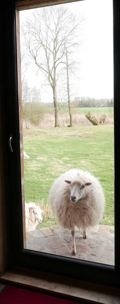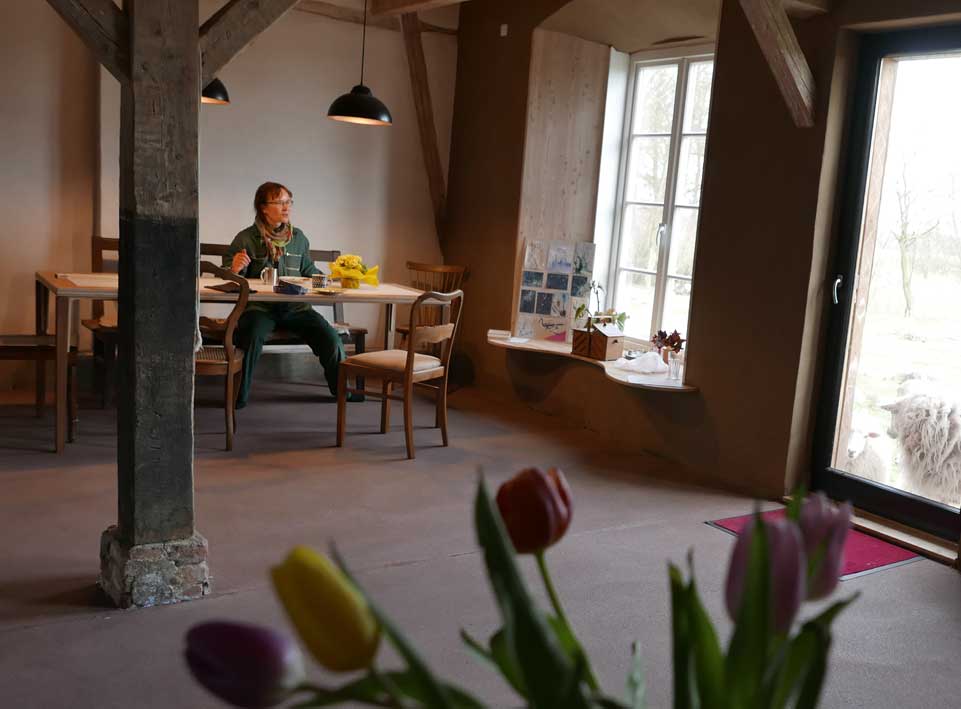 Sabine Grundmann, in Medrow, neben dem Schloss, dem immer noch Grauen. Am Teich vorne und hinten die Wiesen am Wasser auch.
